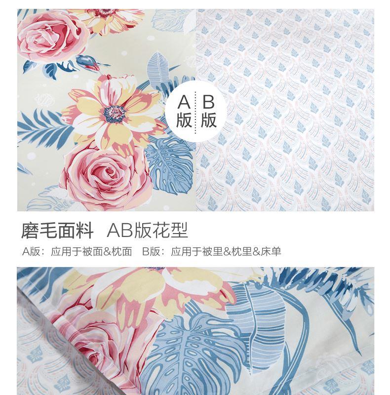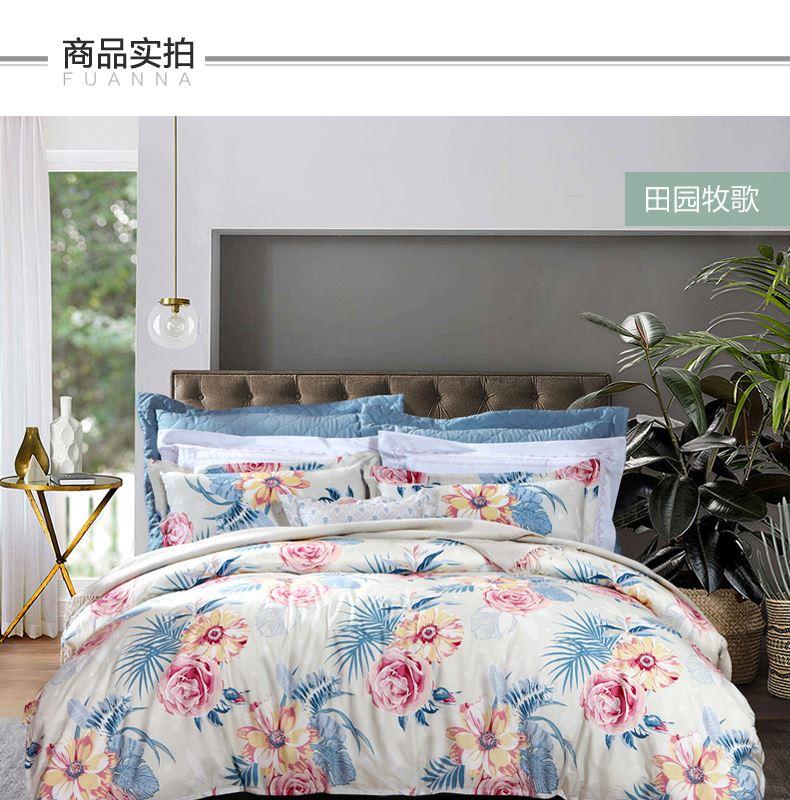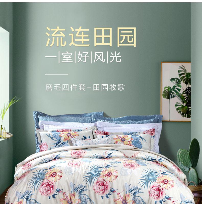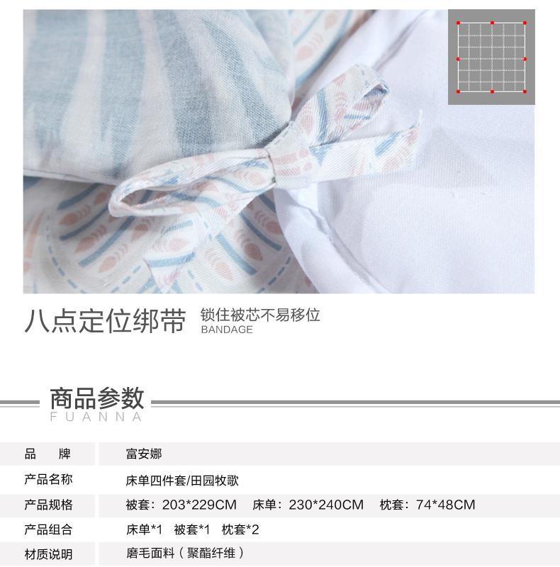 产品名称:富安娜 磨毛四件套-田园牧歌 产品材质:全聚酯纤维 135G 规格: 被套203*229cm*1件 床单230*250cm*1件 枕套74*48cm*2件
