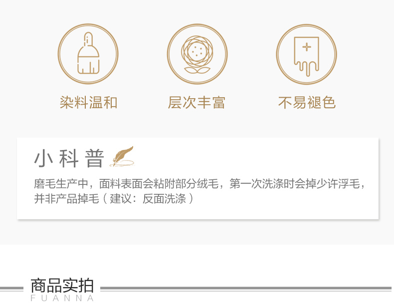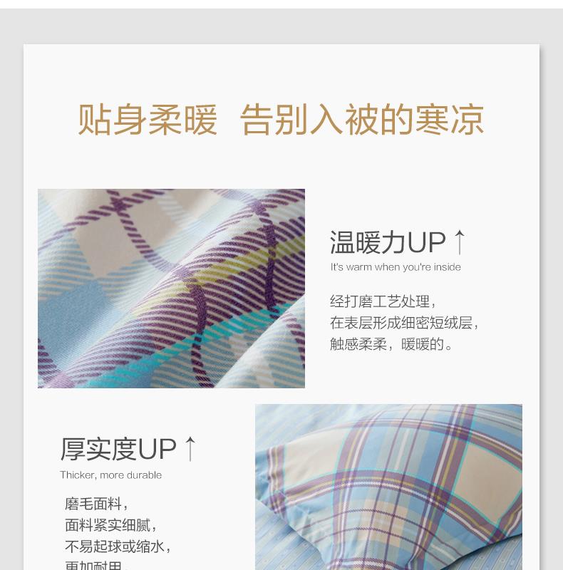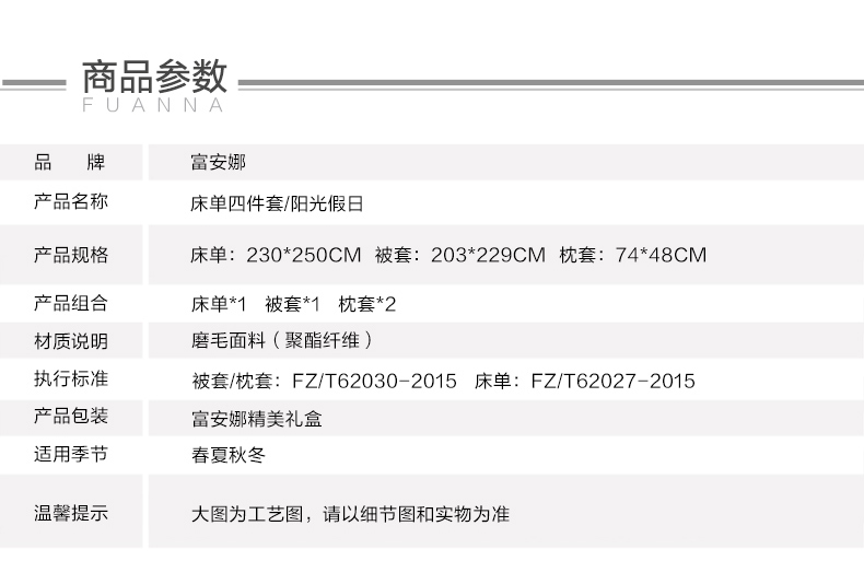 产品名称:富安娜 磨毛四件套-阳光假日 产品材质:全聚酯纤维 135G 规格: 被套203*229cm*1件 床单230*250cm*1件 枕套74*48cm*2件