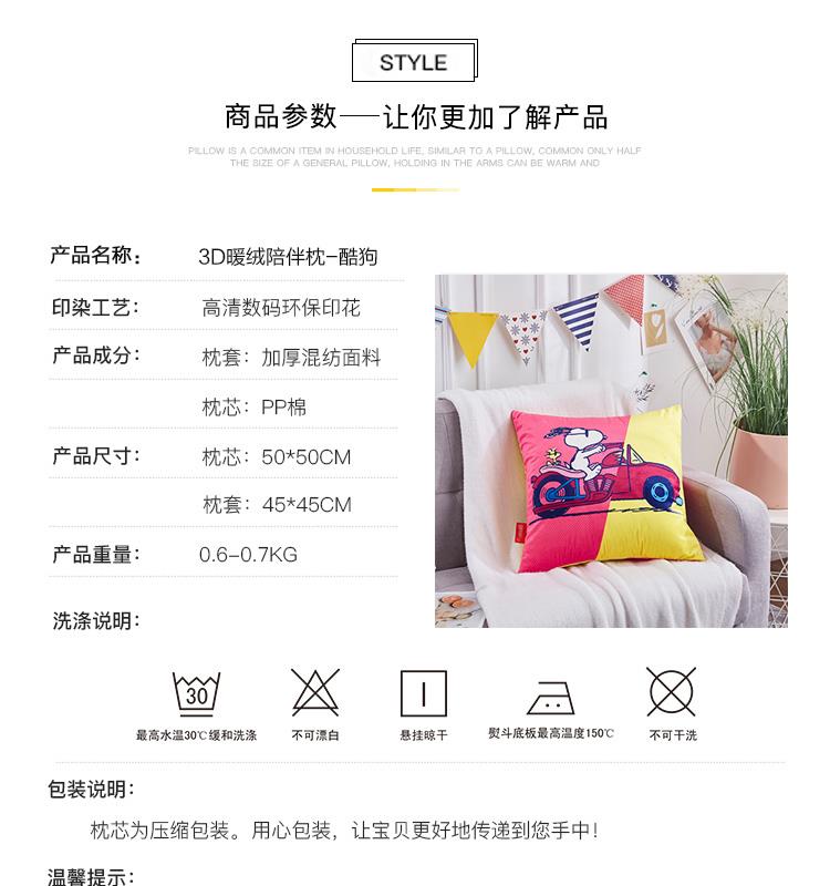 产品品名:Snoopy·史努比3D暖绒陪伴枕 型号:SNB01-1 材质:丽丝绒(全聚酯纤维)高弹纤维