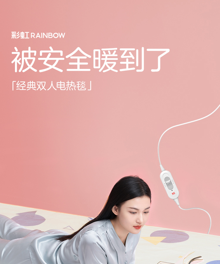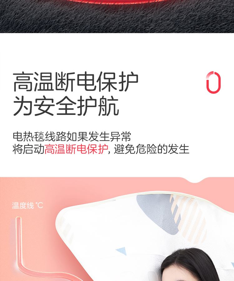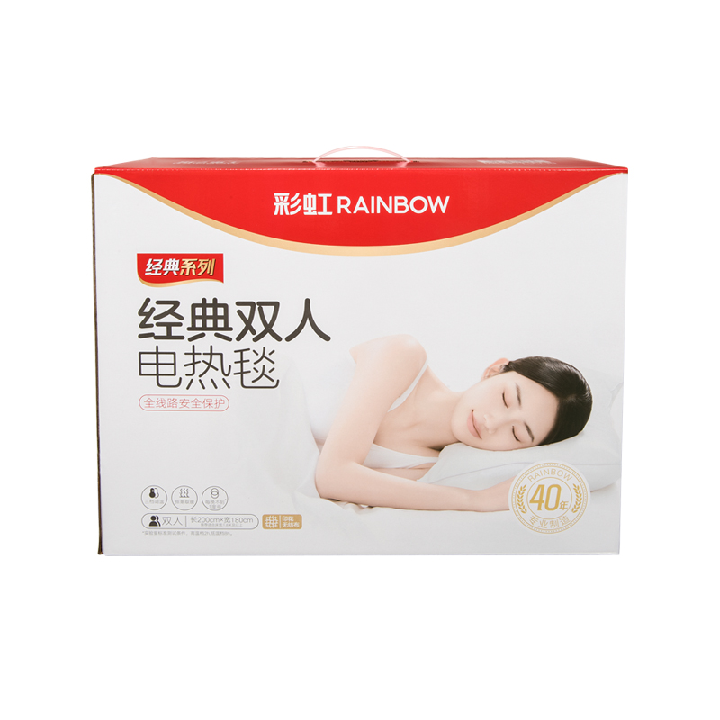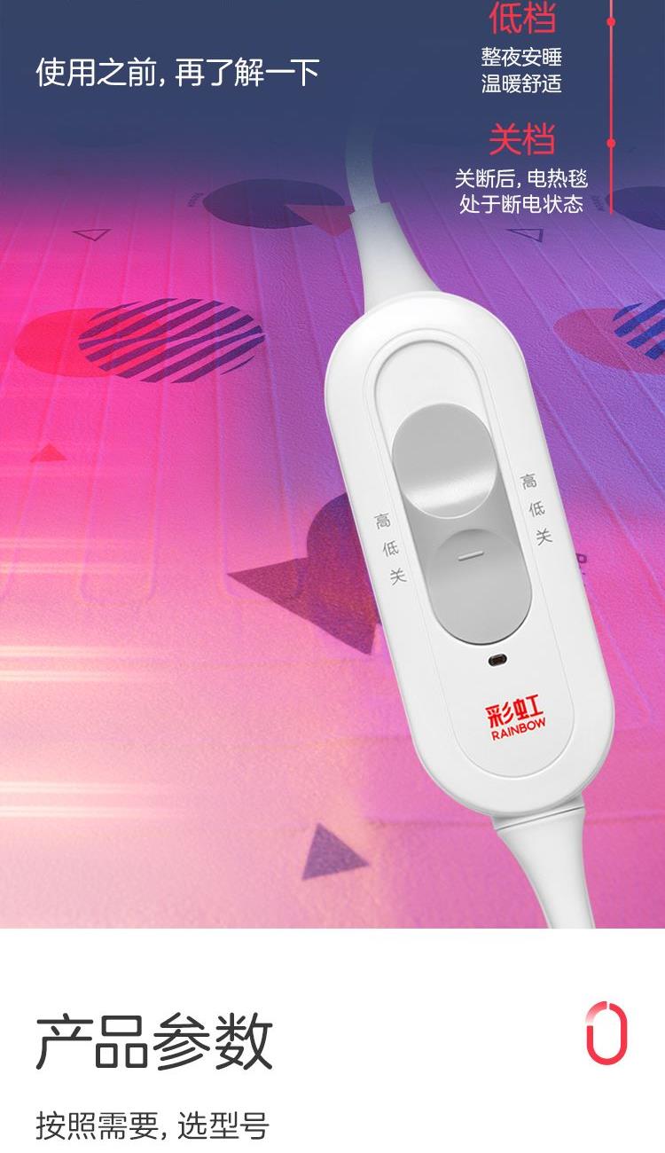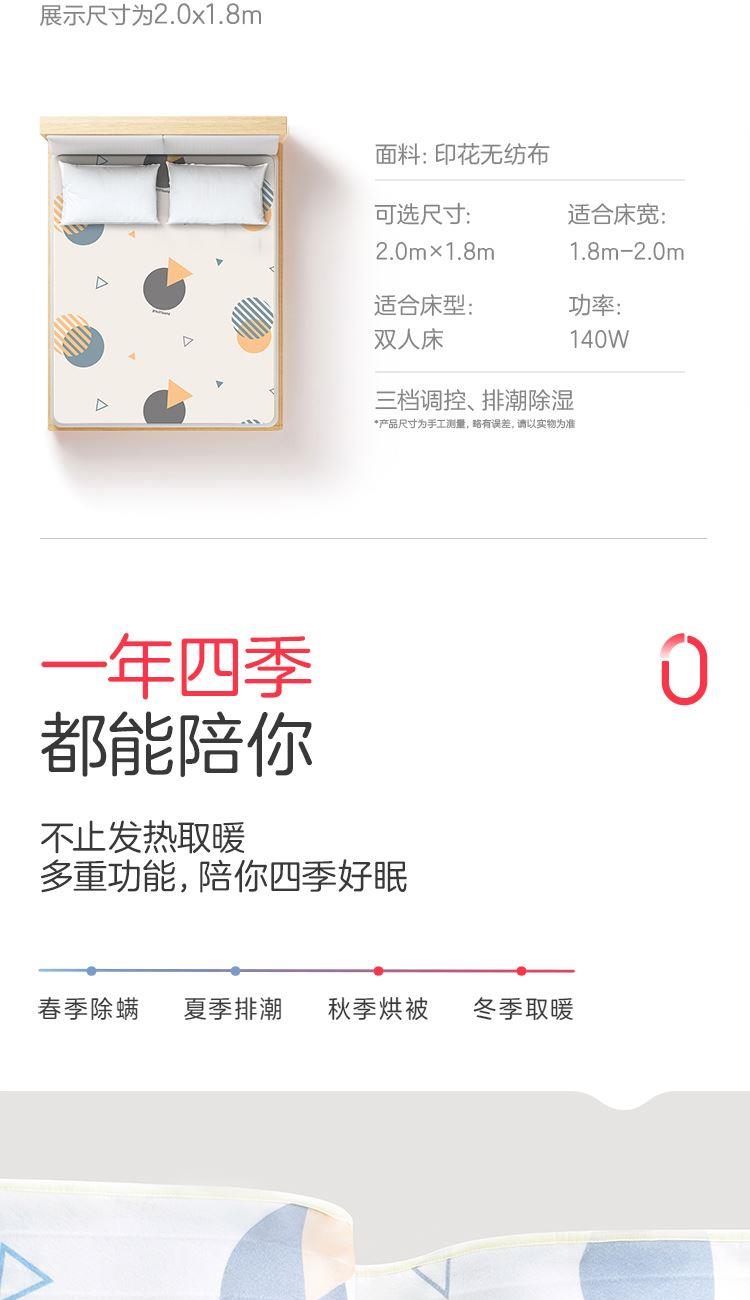 参数: 型号:TT200×180-4X 功率:140W 功能:三档调控,排潮取暖 面料:化纤 包装:彩盒 卖点: 1、全线路安全保护调温电热毯,多挡调温,遇水遇尿不漏电 2、特大宽幅印花面料,透气舒适 3、采用双层螺旋发热线和特别安全保护控制器,实现高温断电保护 4、排潮除螨,四季可用,低能耗,每晚不到一度电!