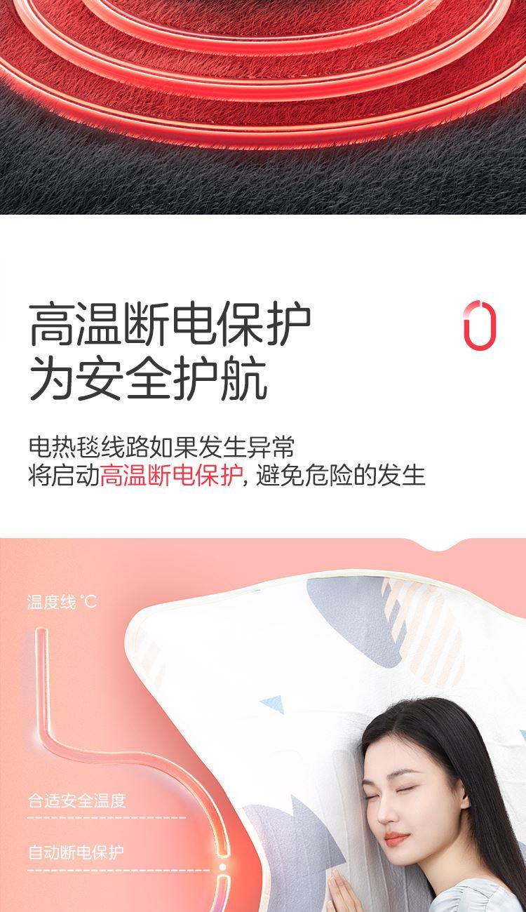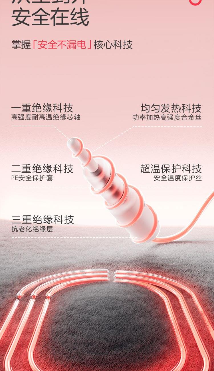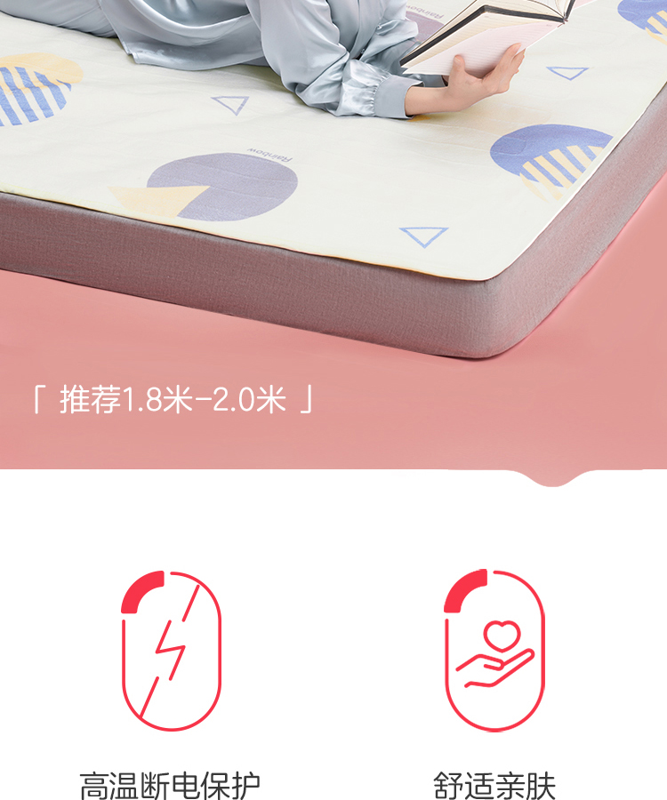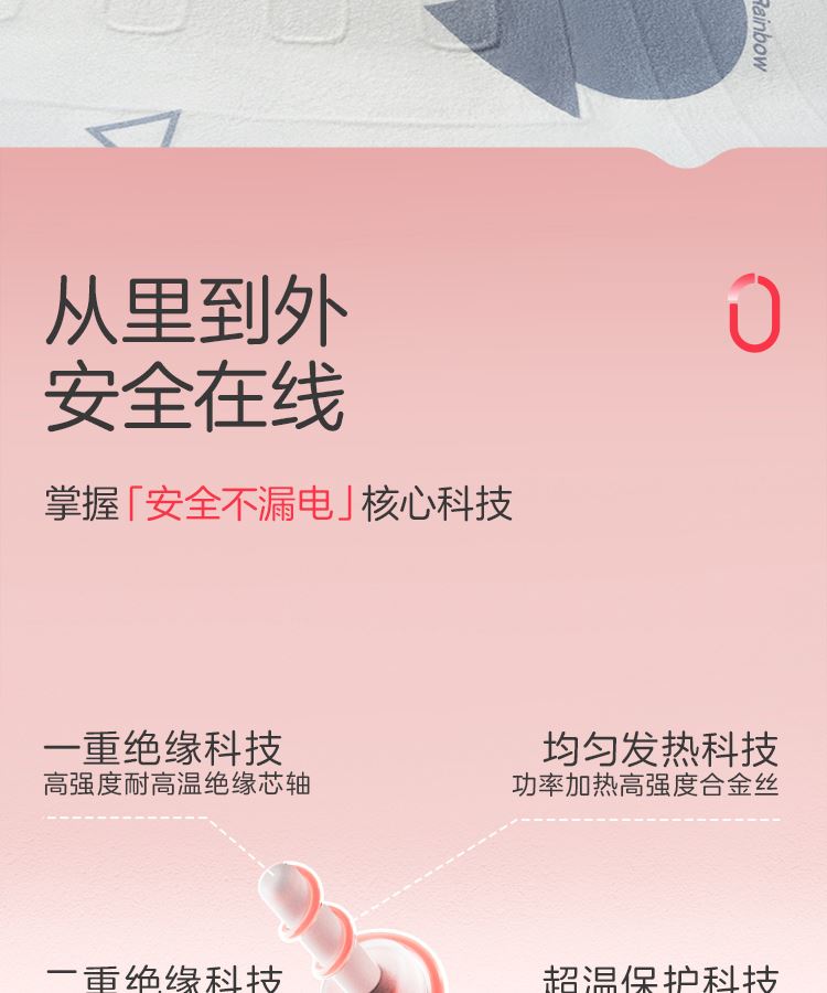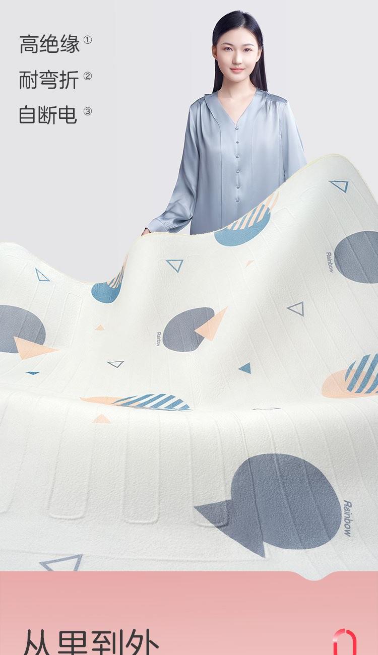 参数: 型号:TT200×180-4X 功率:140W 功能:三档调控,排潮取暖 面料:化纤 包装:彩盒 卖点: 1、全线路安全保护调温电热毯,多挡调温,遇水遇尿不漏电 2、特大宽幅印花面料,透气舒适 3、采用双层螺旋发热线和特别安全保护控制器,实现高温断电保护 4、排潮除螨,四季可用,低能耗,每晚不到一度电!