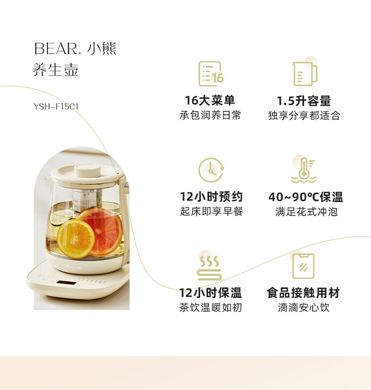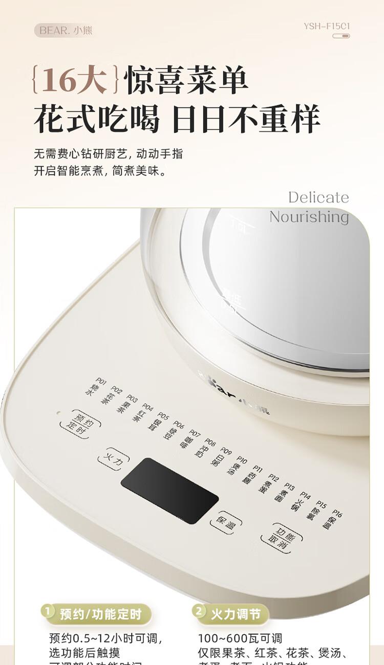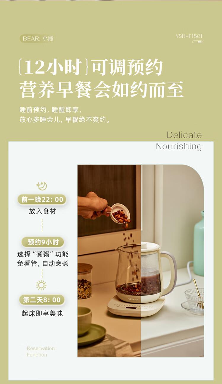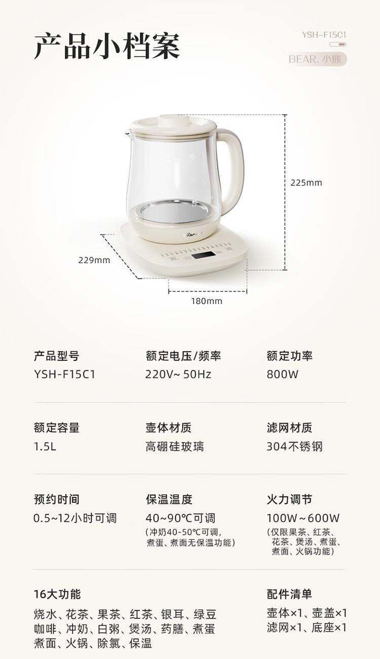 容量 1.5L 16大功能 额定功率 800w 12小时长效预约 产品重量 1.8kg 包装尺寸 266*230*260mm 8台/箱