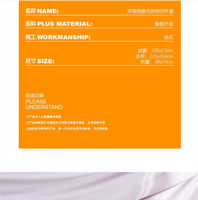 商品名称:啄木鸟呼吸棉磨毛绣花四件套-玛留斯 商品货号:ZHT-0031 商品型号:规格:被套200x230cm 床单245*250cm 枕套48x74cm 商品材质:面料:磨毛