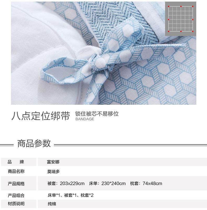 产品名称:富安娜 纯棉四件套-莫瑞多 产品材质:全纯棉 规格: 被套203*229cm*1件 床单230*240cm*1件 枕套74*48cm*2件