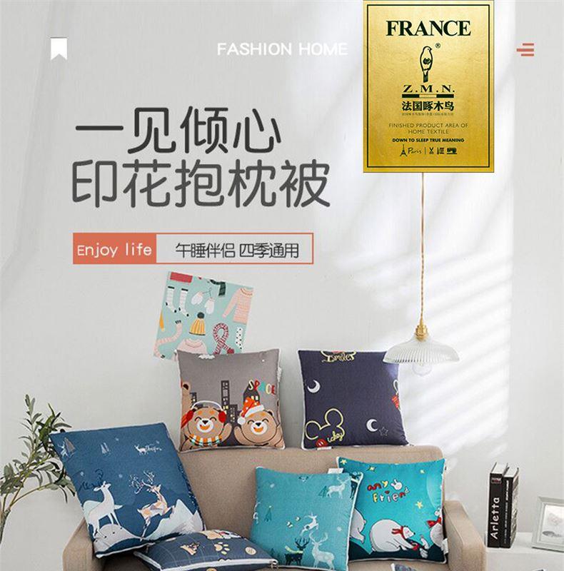 商品名称:啄木鸟磨毛印花抱枕被-温驰 商品货号:ZHB-0011 商品型号:尺寸:40x40cm重量:450g 商品材质:成分:磨毛填充:高弹纤维