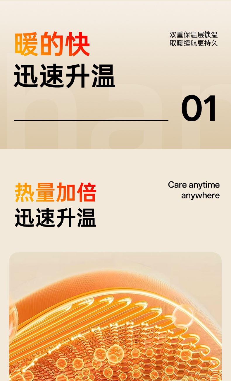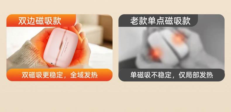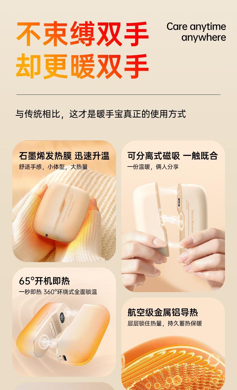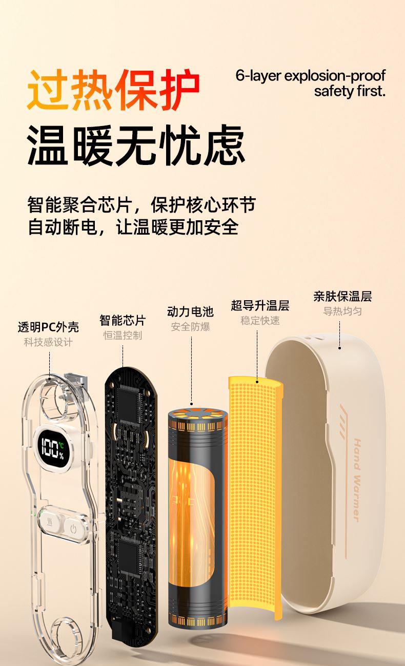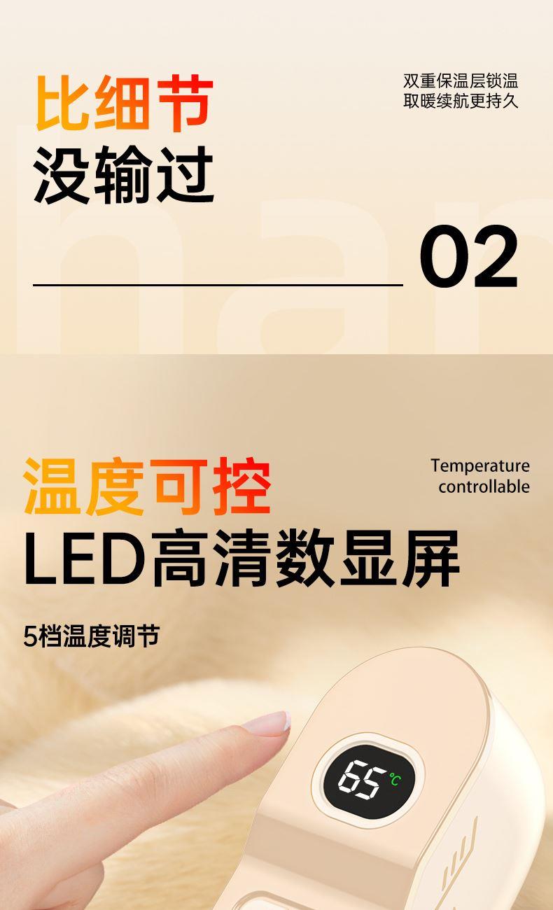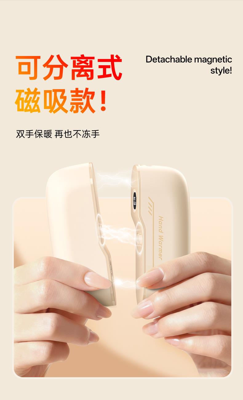 额定电压:5V/1Amax 额定功率:6.2W 产品毛重:268.4g 产品颜色:米白色 电池容量:双边6000mAh 产品尺寸:94*32*71.5mm 主要材质:铝合金 1.内置6000mAh电池,超长续航 2.Type-C充电,同时充俩,方便快捷 3.智能数显屏幕,电量、温度实时显示 4.5档温度调节,一秒即热,冷暖由你掌控 5.可分离磁吸组合设计,合并、单独取暖皆可