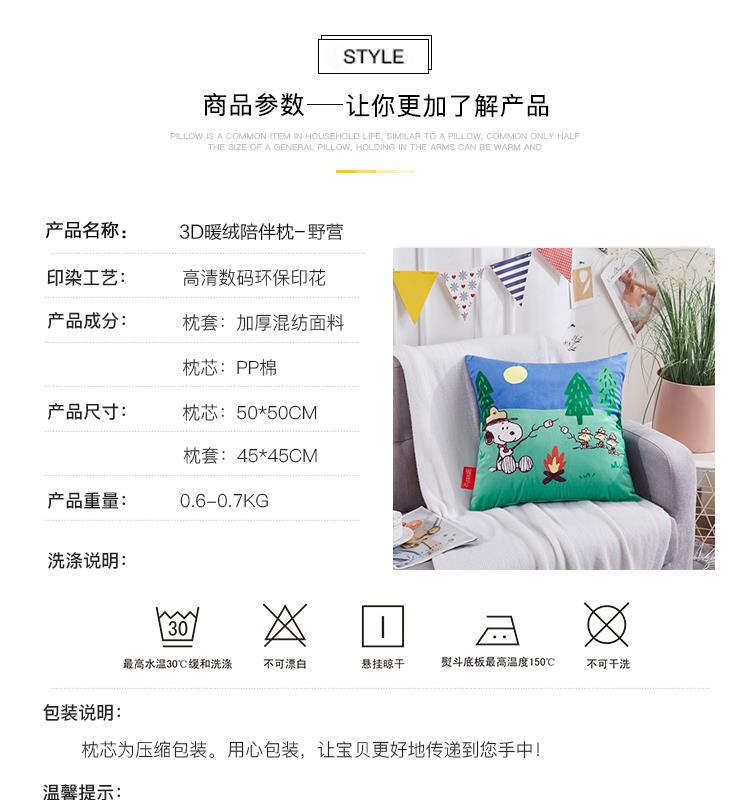 产品品名:Snoopy·史努比3D暖绒陪伴枕 型号:SNB01-3 材质:丽丝绒(全聚酯纤维) 高弹纤维