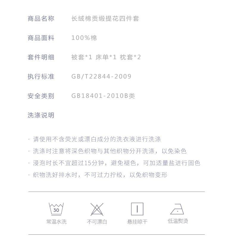 商品名称:啄木鸟100支新疆长绒棉提花四件套-菲伦娜 商品货号:ZMT-0017 商品型号:规格:被套200x230cm 床单245x250cm 枕套48x74cm 商品材质:面料:纯棉