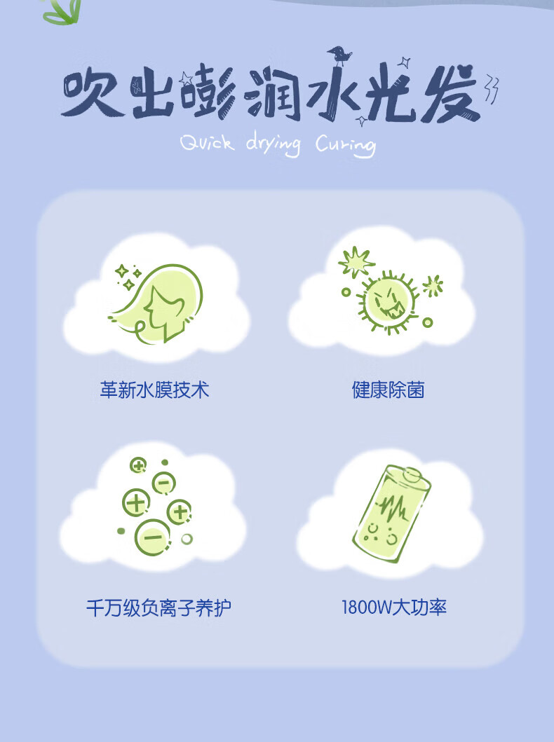 风温档位:4档 护发类型:负离子 电机转速:<30000rpm 特色功能:高速吹风大功率:1800W-2000W