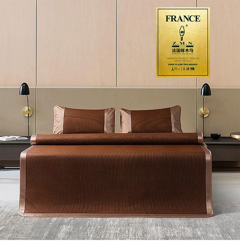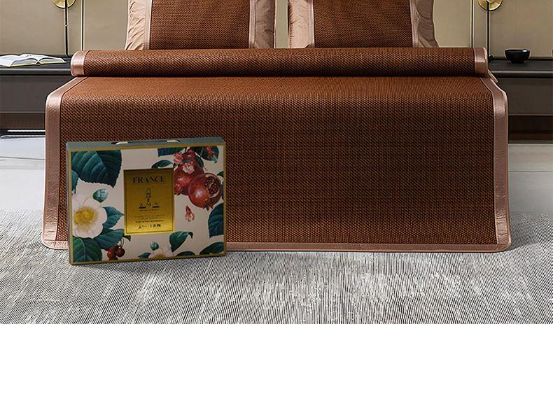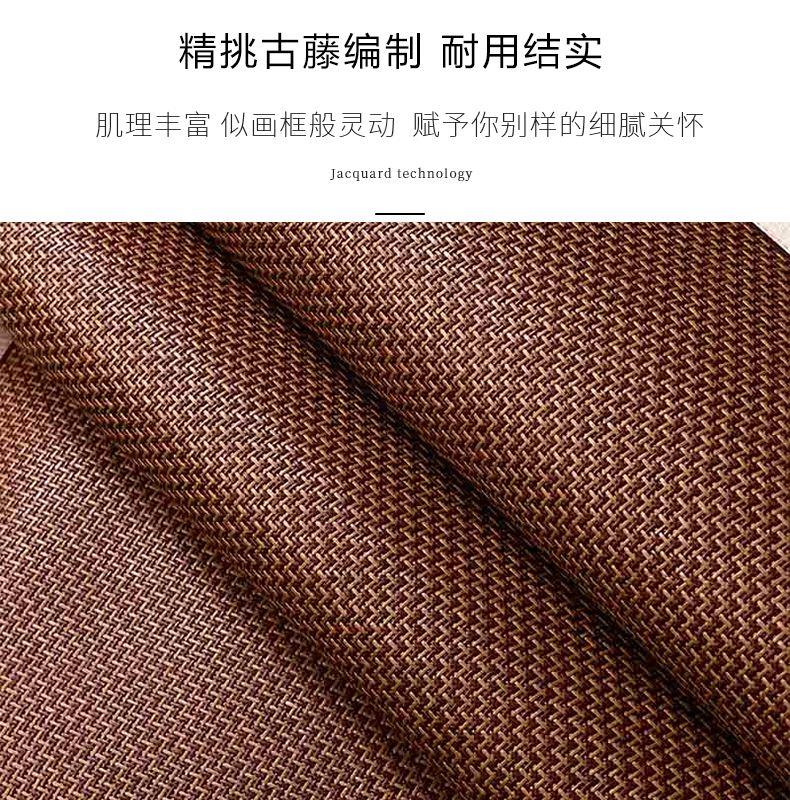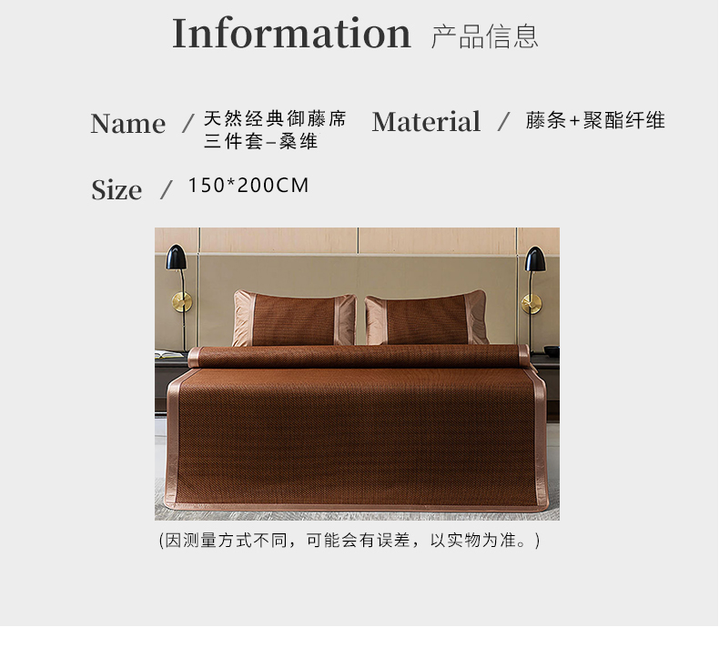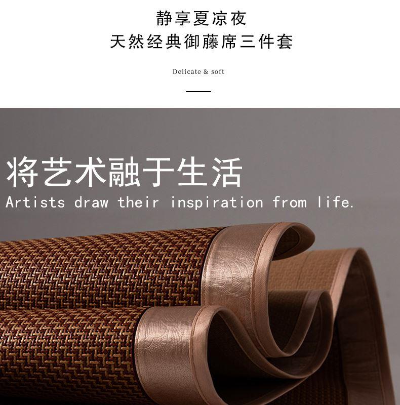商品名称:啄木鸟经典御藤席三件套1.5米-桑维 商品货号:ZLX-0001 商品型号:尺寸:150x200cm重量:1490g 商品材质:面料:藤席