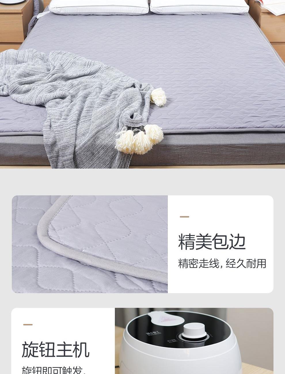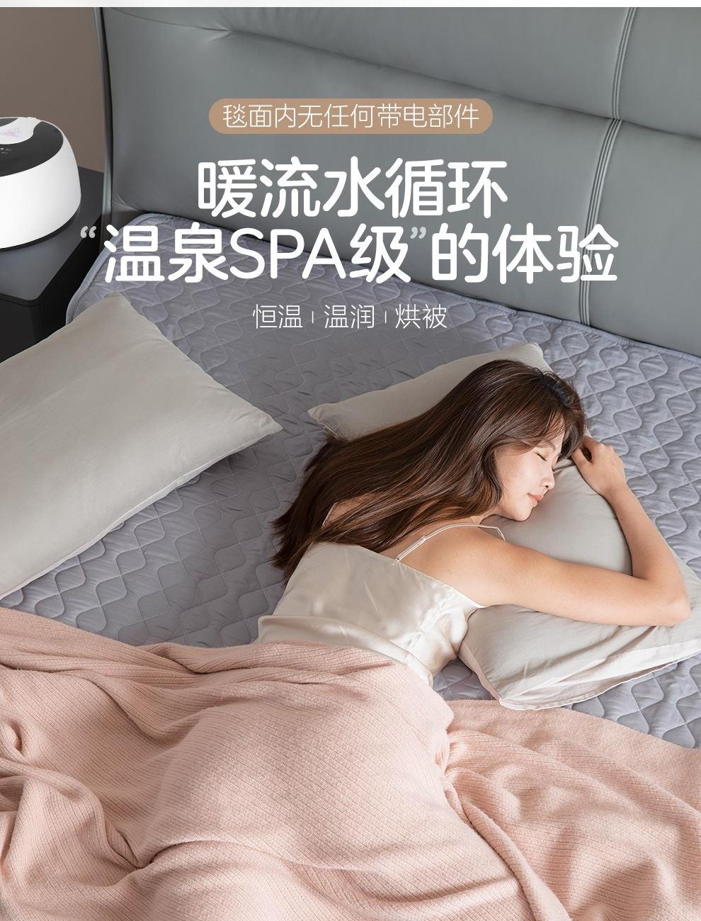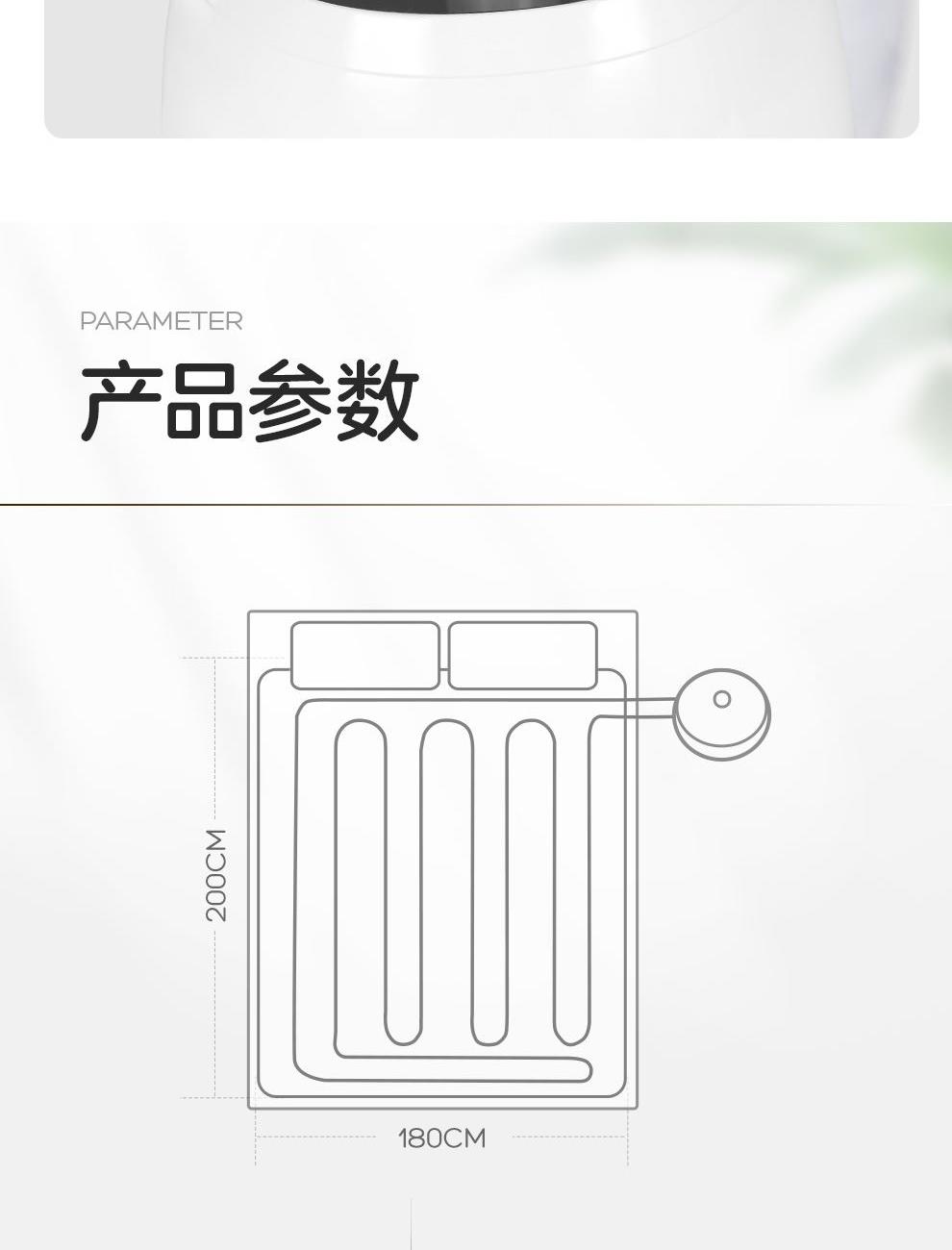 卖点 型号:D186(1.8m*2.0m) 功率:260W 功能:以水传温,整夜恒温,20-65℃控温 ;安全除螨,四季排潮 面料:磨毛短绒 包装:纸盒 参数 1、恒温水暖,整夜温润好眠。技术支撑点:水循环热传导技术。 2、超静音,静享好眠。技术支撑点:DC直流无刷电机静音泵,低噪、经久耐用。 3、6重安全保护,安心好眠。技术支撑点:防过热保护、防倾倒保护、防遗忘保护、防干烧保护、防过流保护、防超温保护。 4、舒适好眠。技术支撑点:PVC管,柔软舒适面料。 5、标准好眠。技术支撑点:水暖毯行业标准制定商。