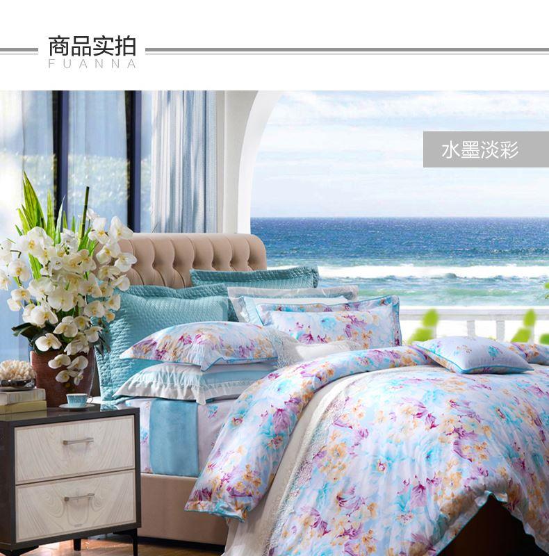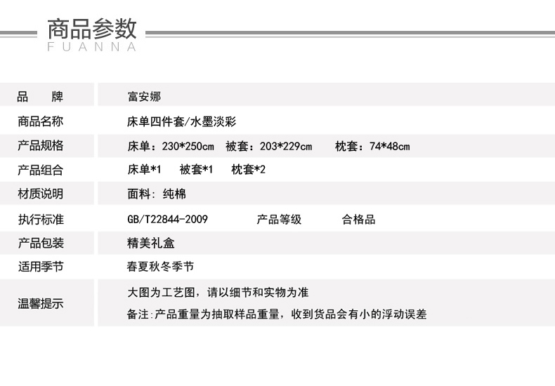产品名称:富安娜 纯棉四件套-水墨淡彩 产品材质:全纯棉 规格: 被套203*229cm*1件 床单230*240cm*1件 枕套74*48cm*2件