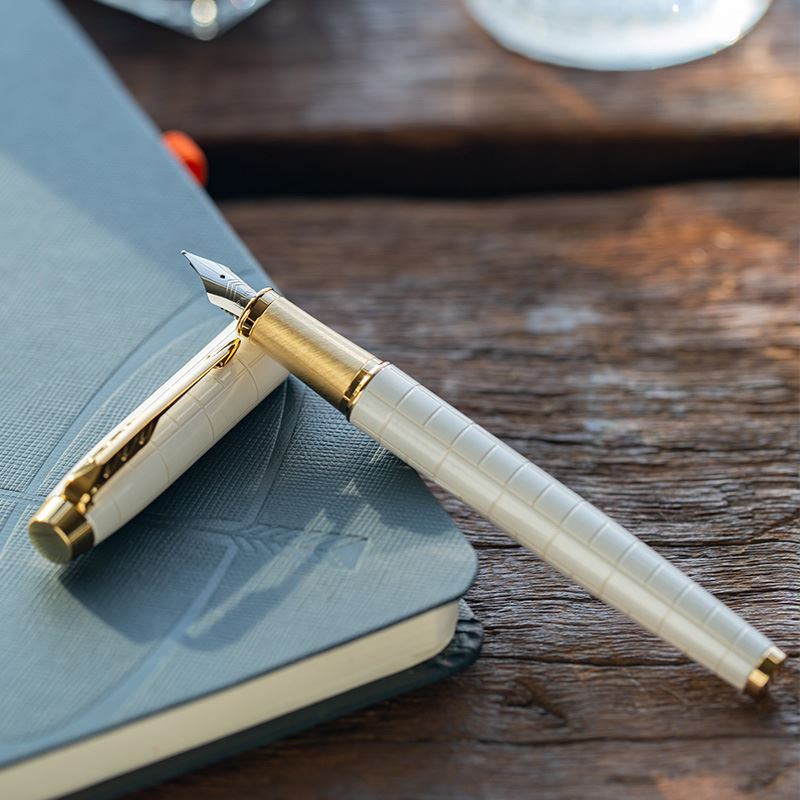 笔尖:不锈钢 笔身:黄铜材质珍珠白亮漆雕刻不对称方格图案 笔饰:镀金抛光 笔帽:黄铜材质珍珠白亮漆雕刻不对称方格图案 配置:笔*1、包装*1、手提袋*1