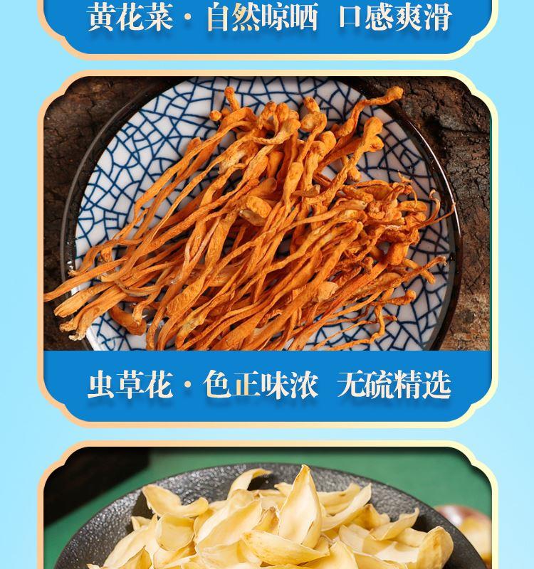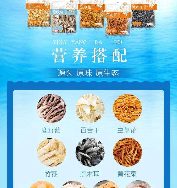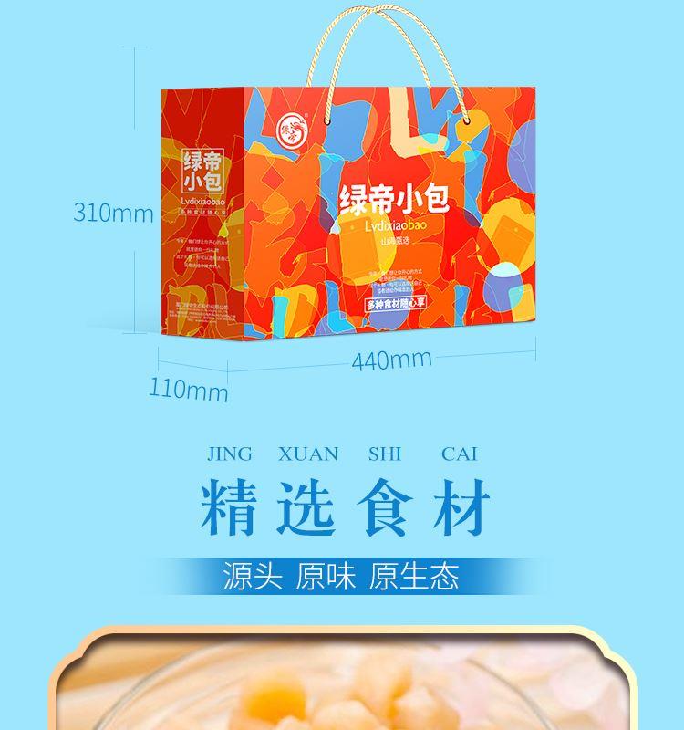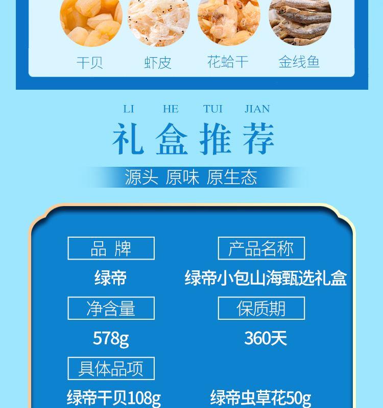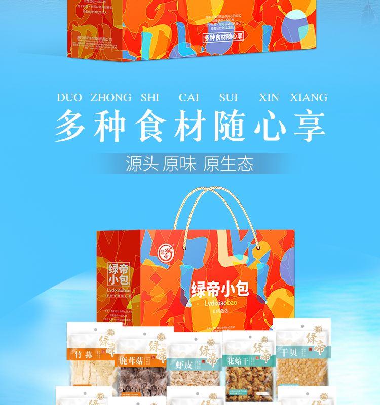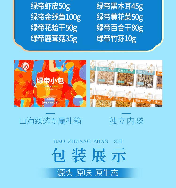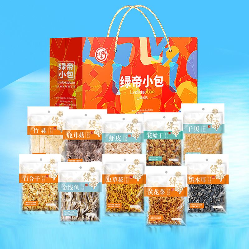 产品组合: 绿帝百合干80g 绿帝鹿茸菇35g 绿帝虫草花50g 绿帝黑木耳45g 绿帝黄花菜50g 绿帝竹荪10g 绿帝干贝108g 绿帝虾皮50g 绿帝金线鱼100g 绿帝花蛤干50g 绿帝山海甄选礼箱