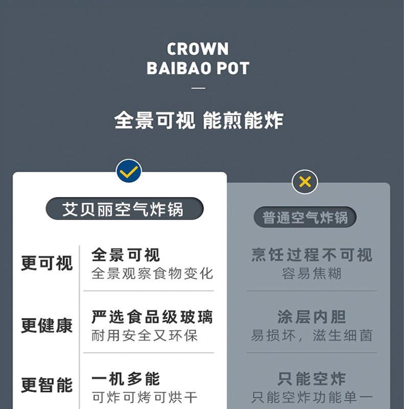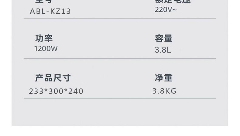 产品型号:ABL-KZ13 产品颜色:米白色 额定功率:1200W 额定电压:220V~ 额定容量:3.8L 产品重量:4.4KG 产品材质:外壳PP+高硼硅钢化玻璃 产品尺寸:233*300*240MM 彩盒尺寸:275*265*340MM 装箱数量:单台为彩盒包装箱;4个/箱
