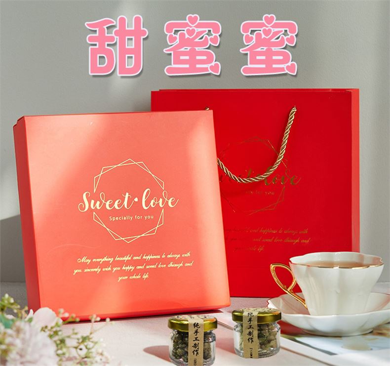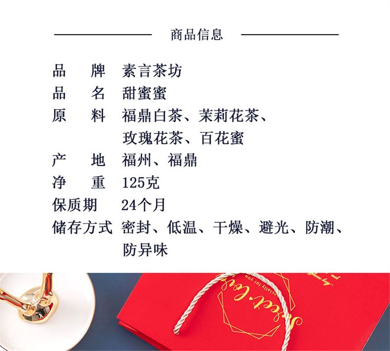 产品品名:甜蜜蜜 产品信息:【品类】茉莉花茶30g、老白茶30g、 玫瑰花茶9g、蜂蜜2罐56g 【重量】125g 【产地】福州、福鼎 【装箱】30盒/箱 【尺寸】21cm*21cm*6.5cm 【产品重量】400g 规格:21cm*21cm*6.5cm 产地:福建福州市、福鼎市