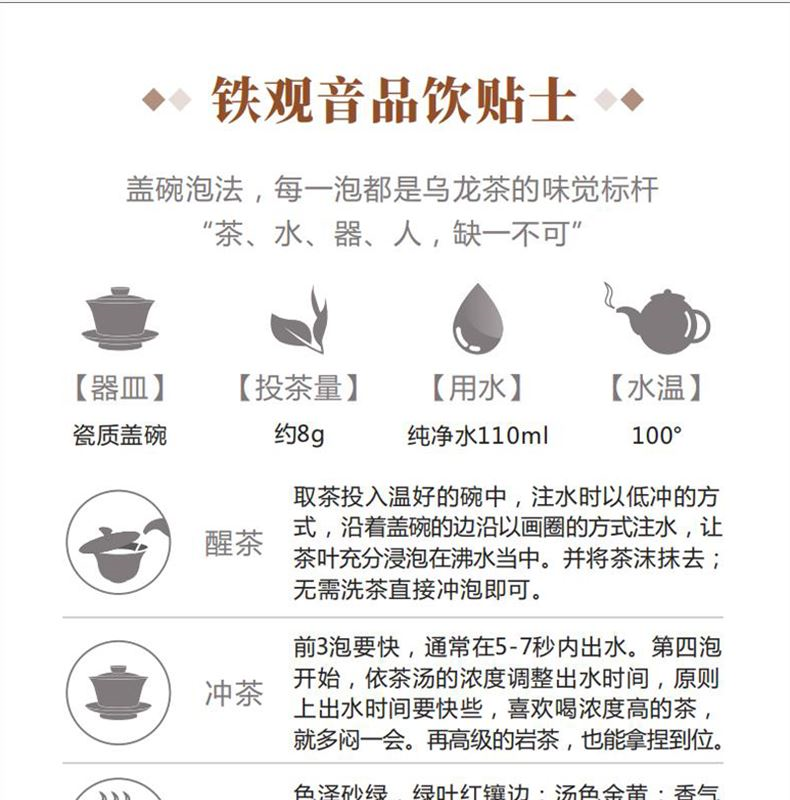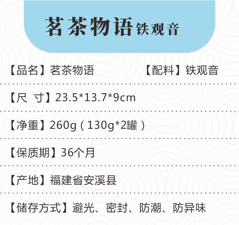 产品品名:茗茶物语铁观音 产品信息:铁观音260g(130g*2罐) 规格:23.5*13.7*9cm 产地:福建安溪县