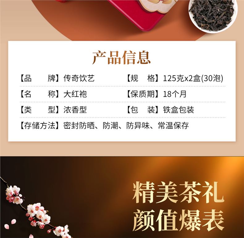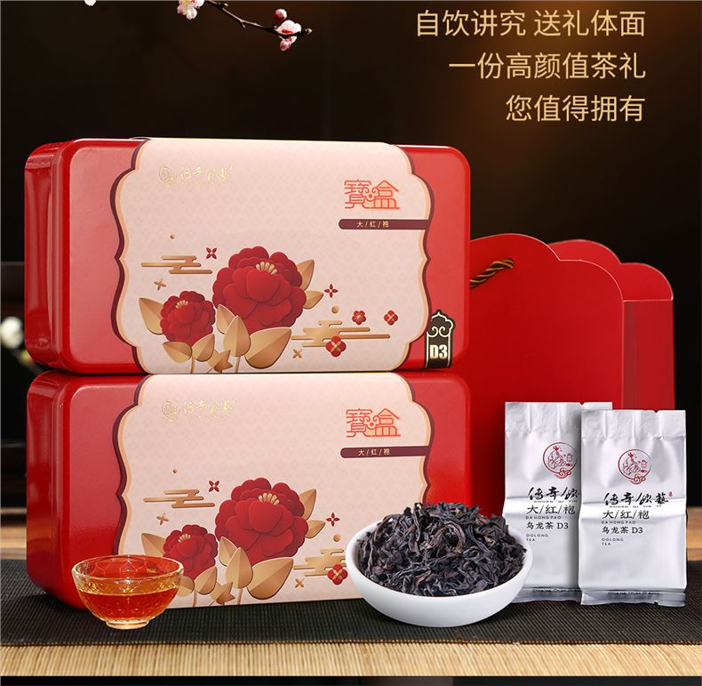 商品名称:宝盒系列大红袍D3 规格:250克(125克/盒*2盒配一提手提袋) 尺寸:28.5*24.5*13cm 大红袍D3(250克/盒*2盒共60泡,配一提手提袋)正季春茶原叶,地道岩韵,岩骨花香,创意包装,绿色环保,喝完茶叶可当纸巾盒使用