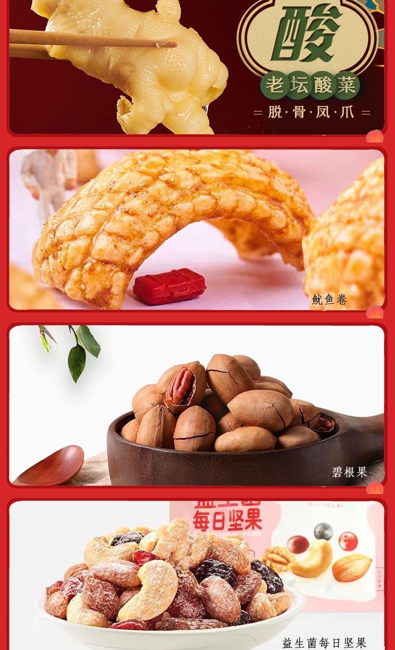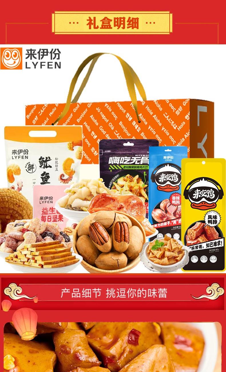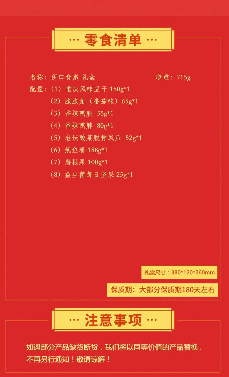 来伊份伊口食惠礼盒715g 重庆风味豆干150g*1 脆脆角(番茄味)65g*1 香辣鸭肫55g*1 香辣鸭脖80g*1 老坛酸菜脱骨凤爪52g*1 鱿鱼卷188g*1 碧根果100g*1 益生菌每日坚果25g*1