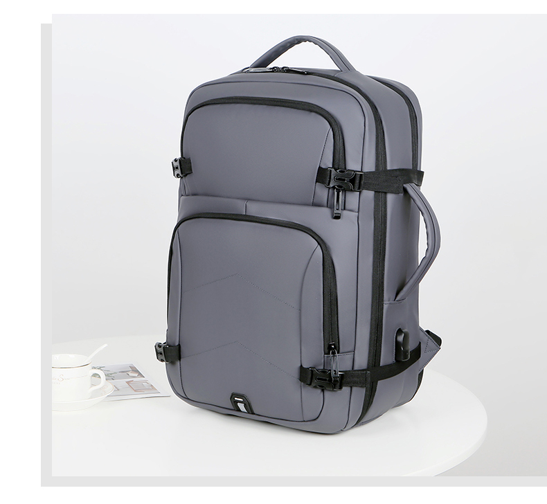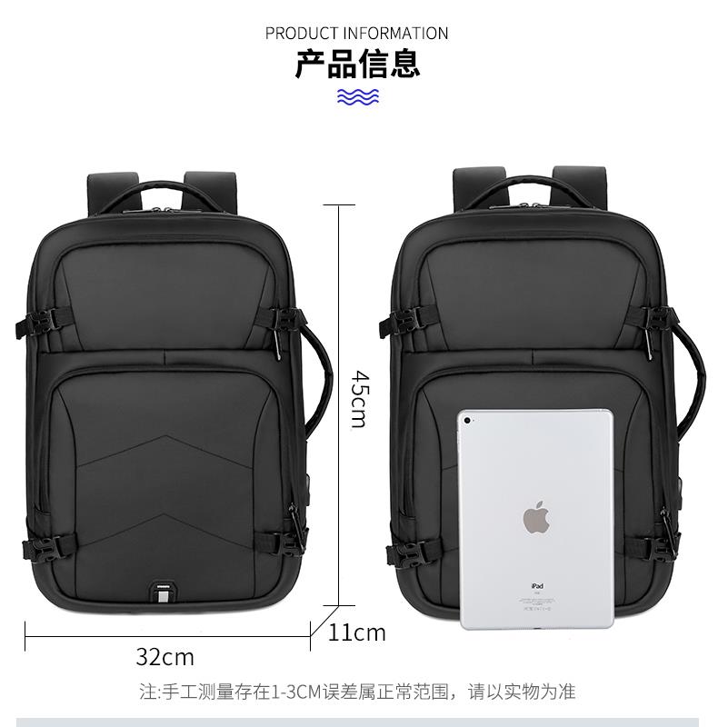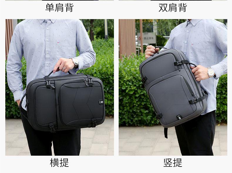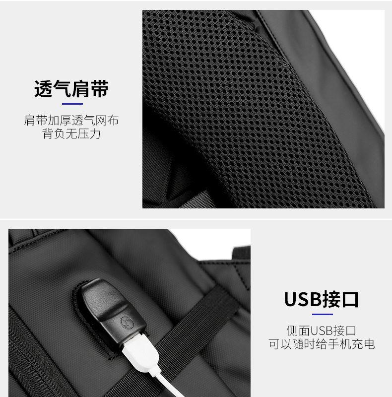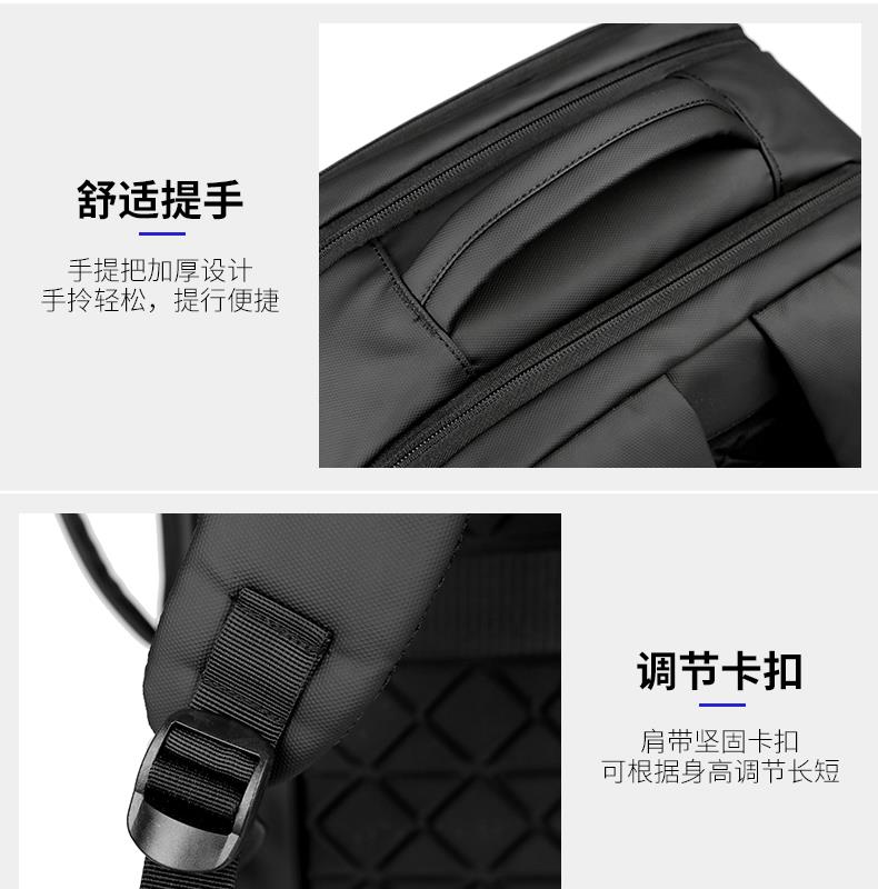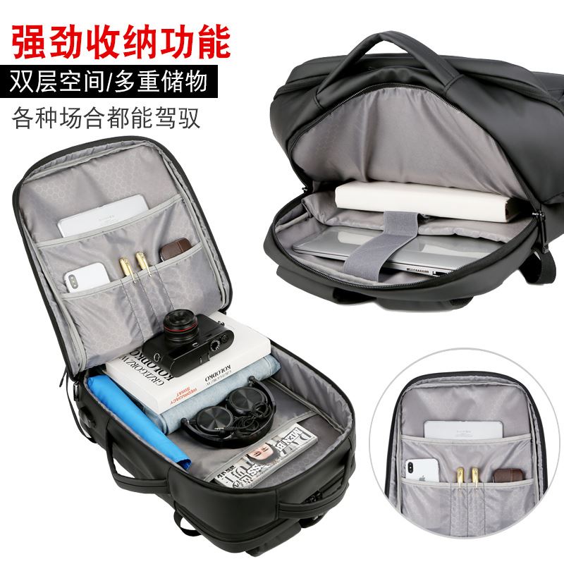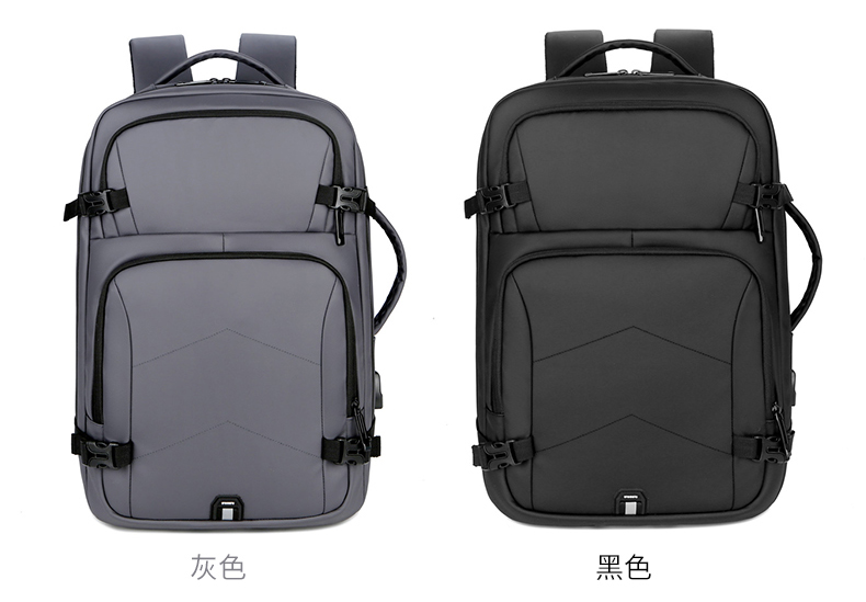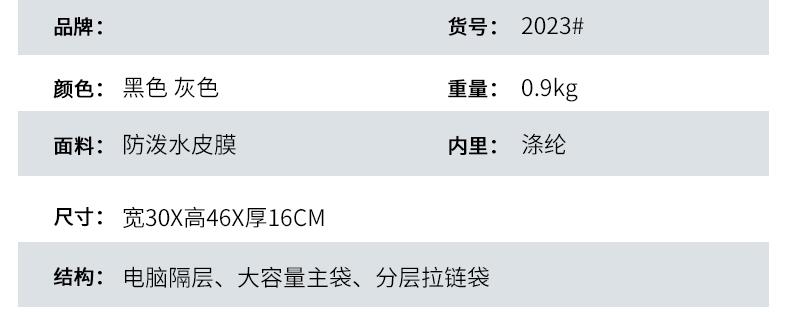 产品参数: 型号:背包3109 颜色:黑,灰 尺寸:30*46*16cm 材质:防水皮膜 重量:0.9kg 商品简介: 商务休闲背包,皮膜材质轻盈且耐磨,正面侧面手提,满足不同的拿取需求,大开合设计,多分区隔层,拉杆固定带,使差旅出行更便捷