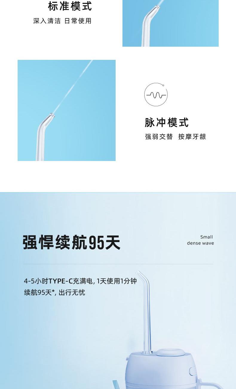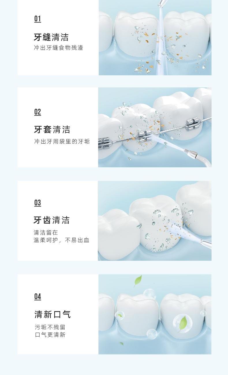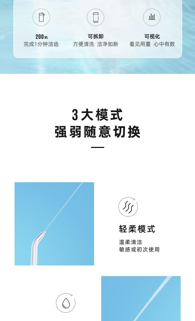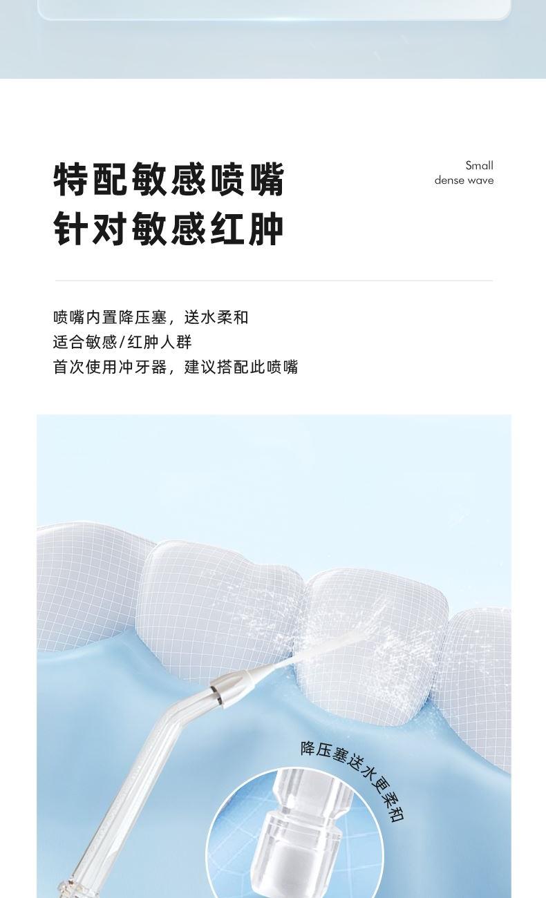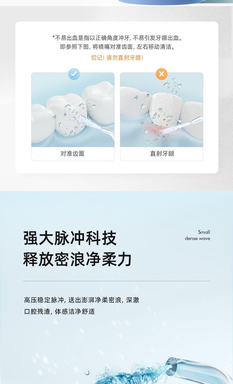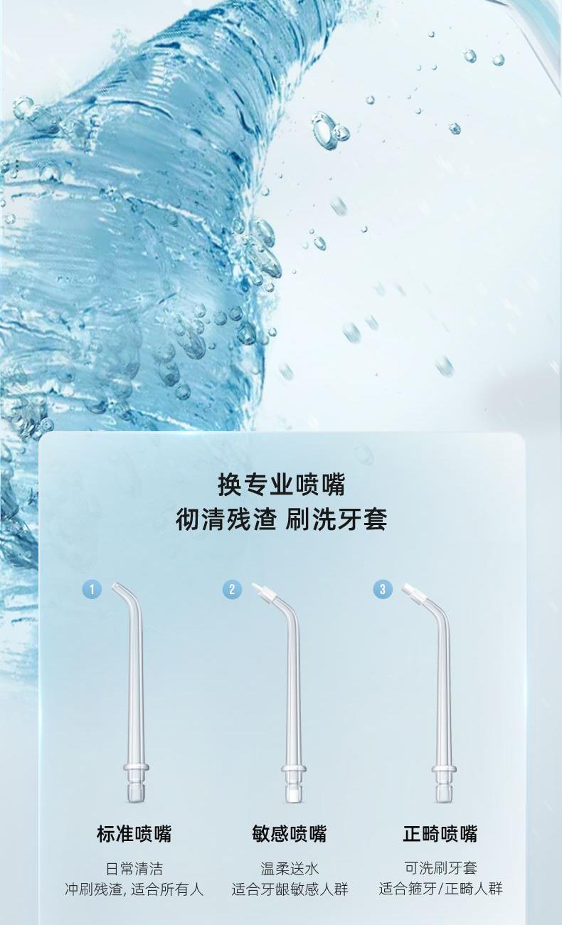 ·3秒渐强:力度从弱渐强,好适应/不伤龈/防出血 ·200ml大水箱,可拆卸抽拉式水箱,携带清洗方便 ·2500mah大电池:续航95天,按每日一次,一次一分钟 ·1400次/分钟高频脉冲,有效冲净牙渍; ·0.6mm细腻水柱,聚焦,深入盲区; ·隐藏式喷嘴收纳,卫生便捷; ·IPX7防水等级,安心水下冲洗; ·个性化喷嘴(标准,正畸,敏感); ·3种冲牙模式(轻柔,标准,脉冲);
