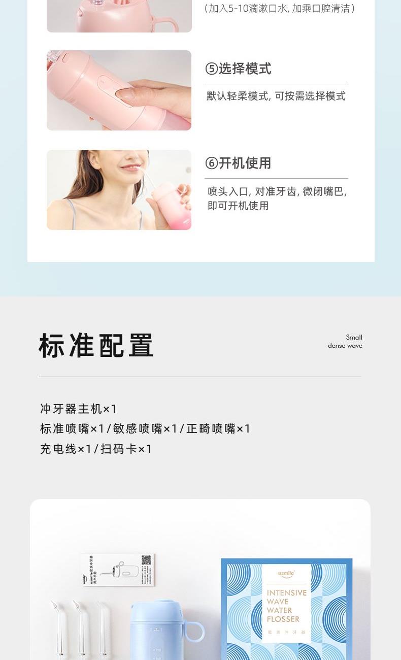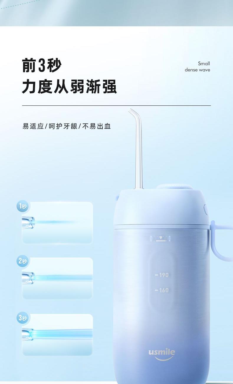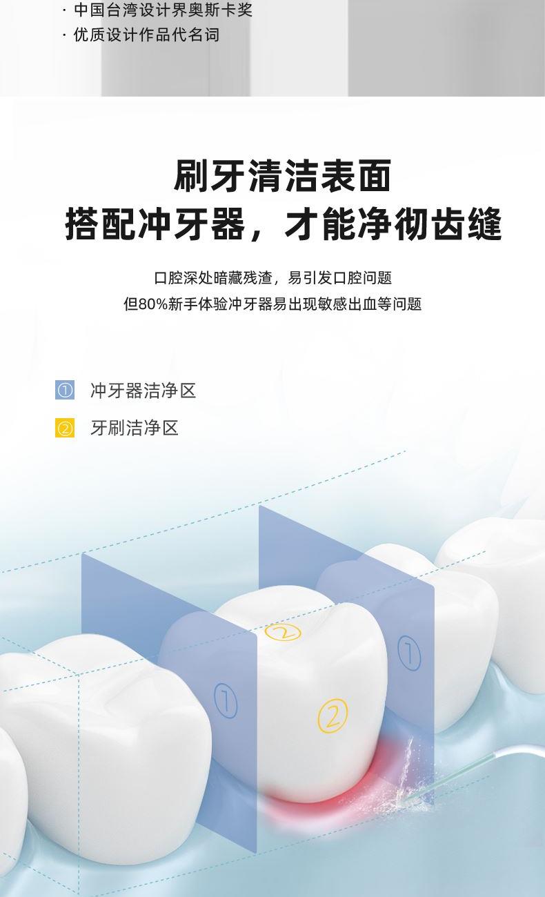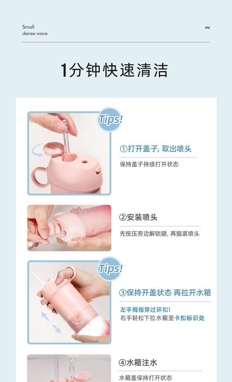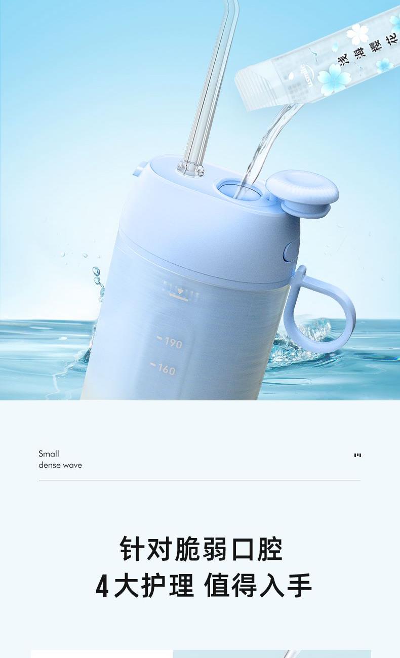 ·3秒渐强:力度从弱渐强,好适应/不伤龈/防出血 ·200ml大水箱,可拆卸抽拉式水箱,携带清洗方便 ·2500mah大电池:续航95天,按每日一次,一次一分钟 ·1400次/分钟高频脉冲,有效冲净牙渍; ·0.6mm细腻水柱,聚焦,深入盲区; ·隐藏式喷嘴收纳,卫生便捷; ·IPX7防水等级,安心水下冲洗; ·个性化喷嘴(标准,正畸,敏感); ·3种冲牙模式(轻柔,标准,脉冲);