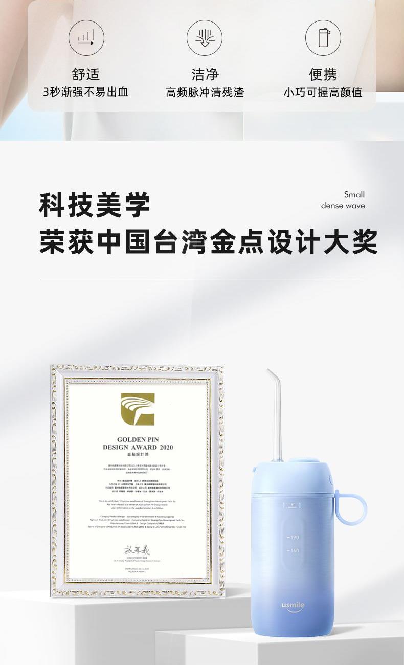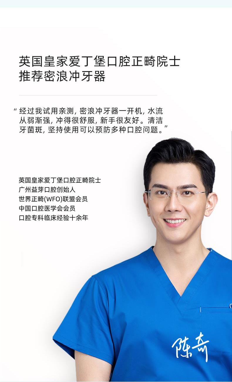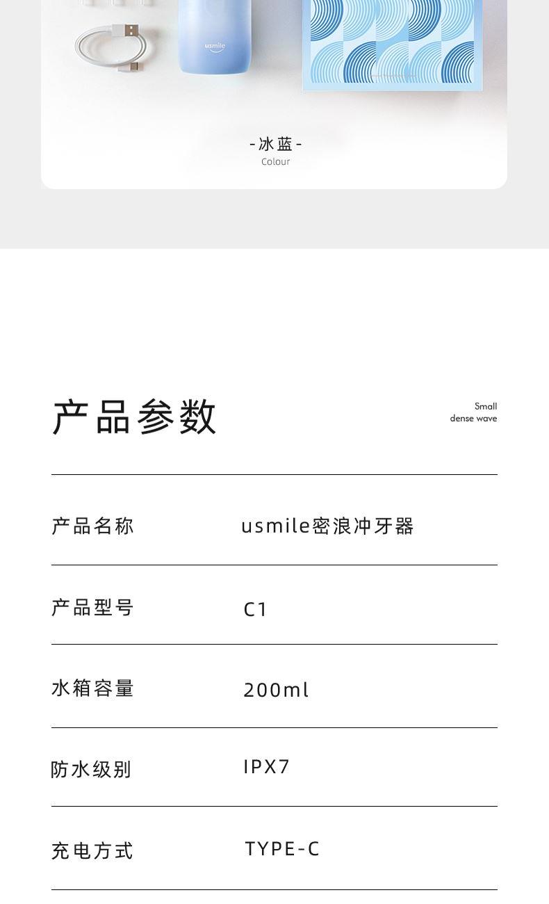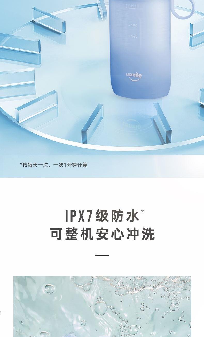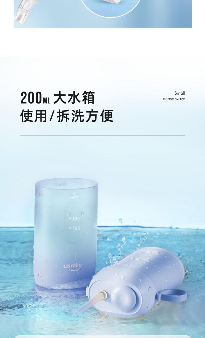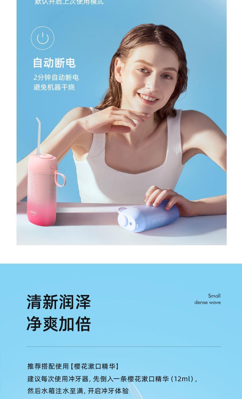 ·3秒渐强:力度从弱渐强,好适应/不伤龈/防出血 ·200ml大水箱,可拆卸抽拉式水箱,携带清洗方便 ·2500mah大电池:续航95天,按每日一次,一次一分钟 ·1400次/分钟高频脉冲,有效冲净牙渍; ·0.6mm细腻水柱,聚焦,深入盲区; ·隐藏式喷嘴收纳,卫生便捷; ·IPX7防水等级,安心水下冲洗; ·个性化喷嘴(标准,正畸,敏感); ·3种冲牙模式(轻柔,标准,脉冲);