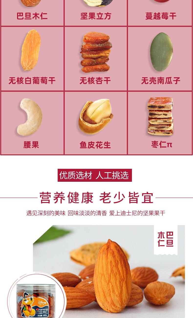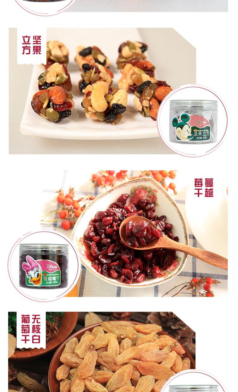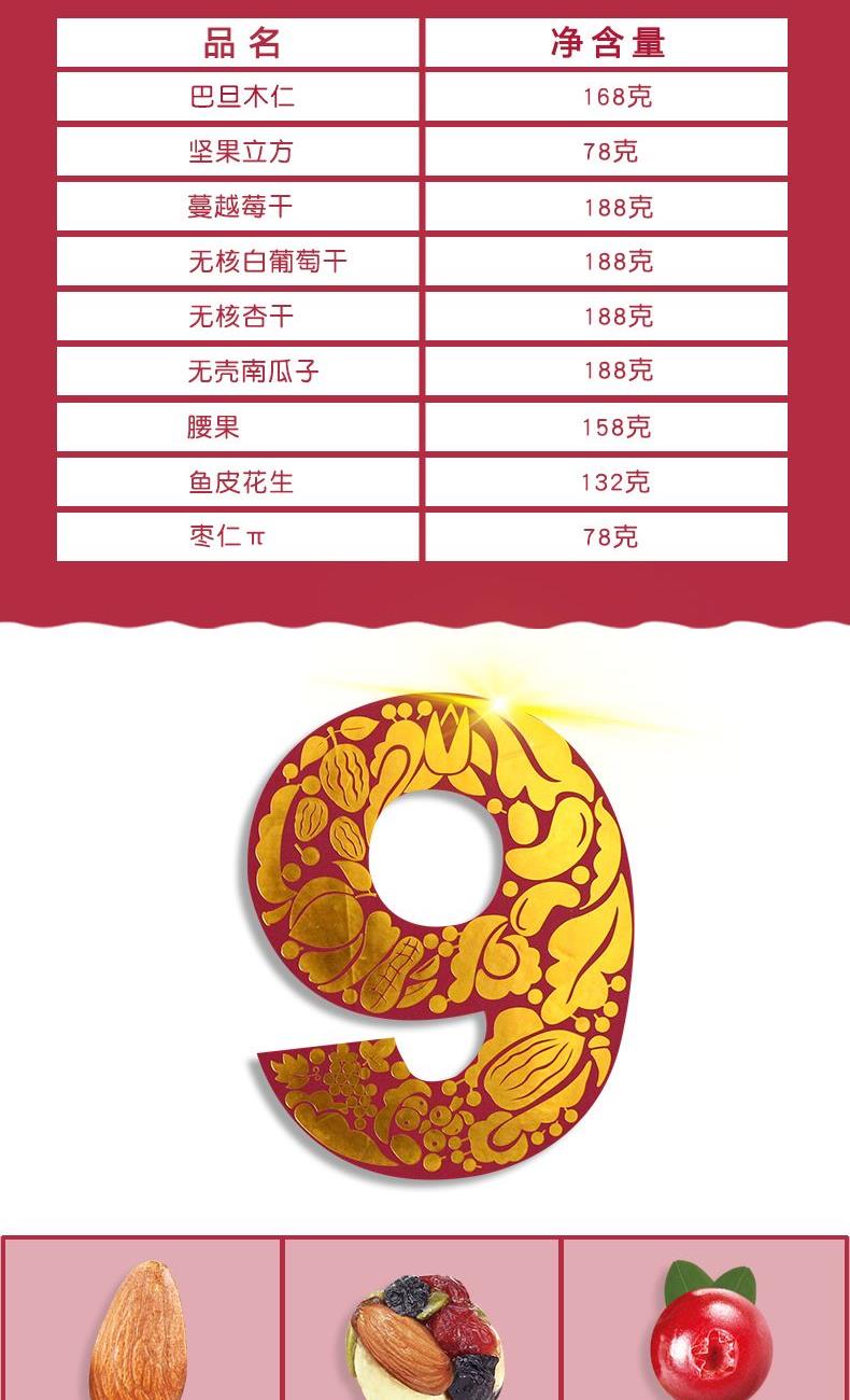 巴旦木仁168g, 坚果立方78g, 蔓越莓干188g, 无核白葡萄干188g, 无核杏干188g, 无壳南瓜子188g, 腰果158g, 鱼皮花生132g, 枣仁π 78g