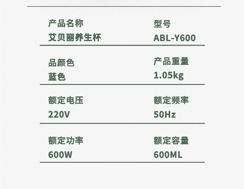 产品型号:ABL-Y600 产品颜色:蓝色 额定功率:600W 额定电压:220V~ 额定容量:600ML 产品重量:1.05KG 产品尺寸:161*106*212MM 包装尺寸:240*218*180MM 装箱数量:单台为彩盒包装箱;8个/箱