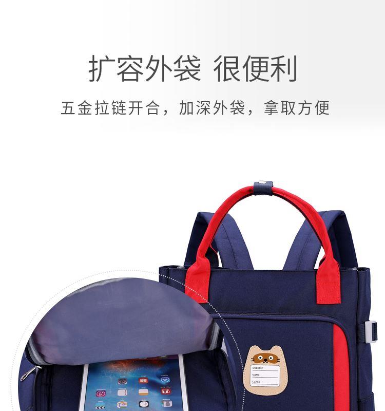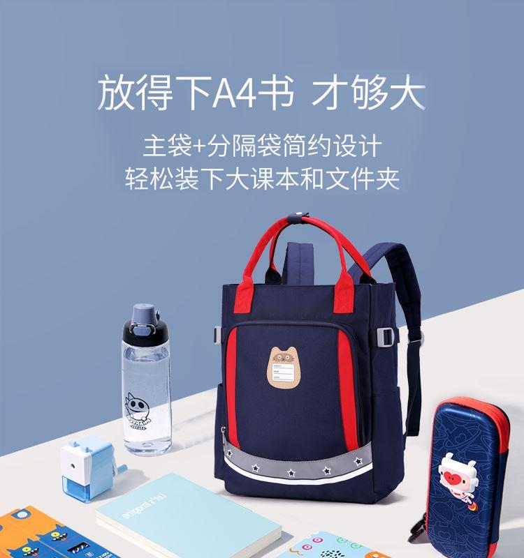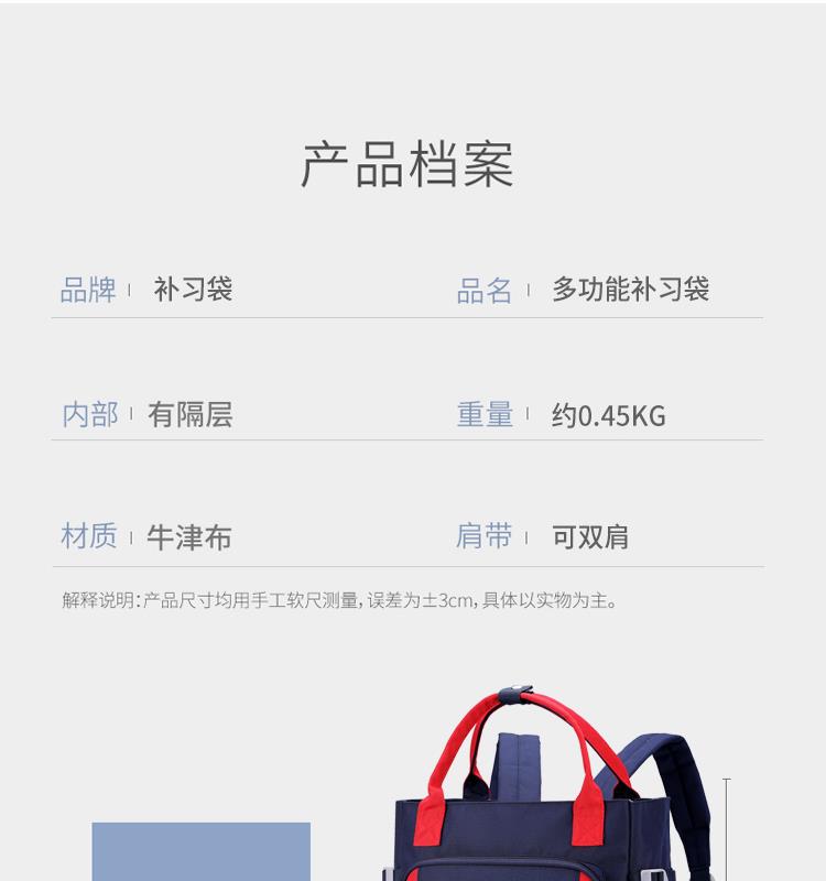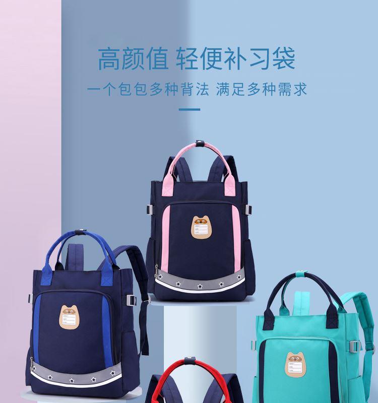 产品参数: 型号:儿童书包-补习包3201 颜色:蓝色、红色、粉色、湖蓝色 尺寸:28*12*37cm 材质:牛津布 内部:有隔层 重量:0.45kg 商品简介: 外部选用高密度防泼水耐磨牛津布,是书包也是补习袋,能提能挽,也能单双肩,多种背法,满足多种需求。大容量、名片的设计,让你的出行社交更加便捷!