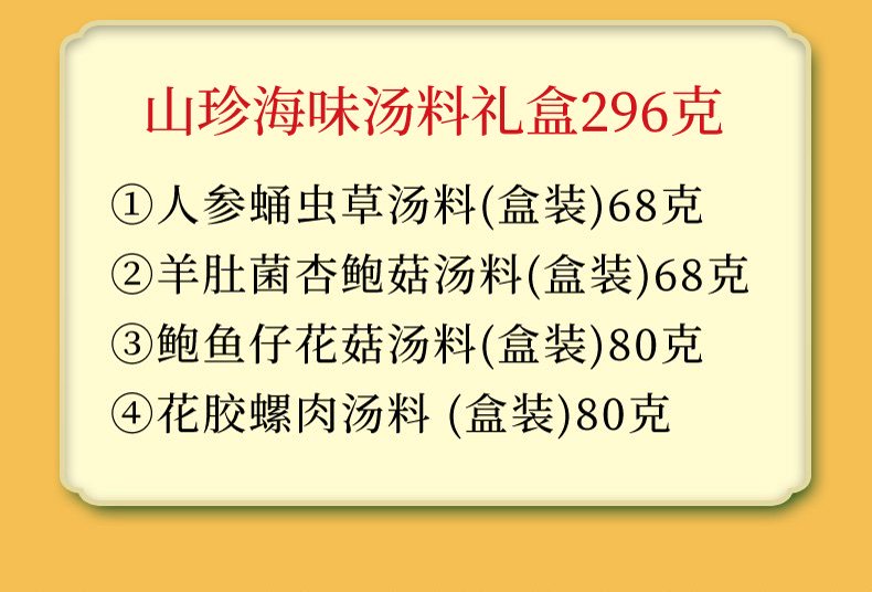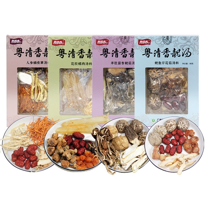 人参蛹虫草汤料(盒装)68克 羊肚菌杏鲍菇汤料(盒装)68克 鲍鱼仔花菇汤料(盒装)80克 花胶螺肉汤料 (盒装)80克