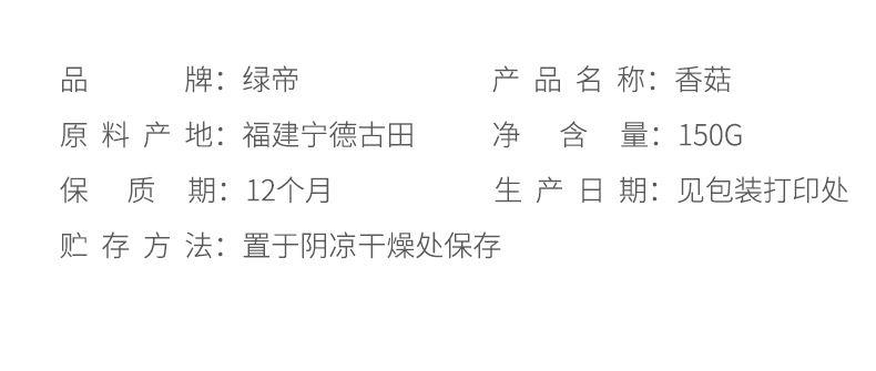 商品名称:绿帝香菇 重量:150g/袋 产地:福建宁德 保质期:365天