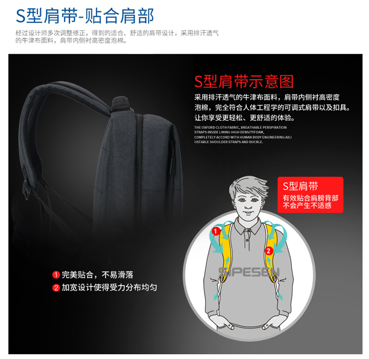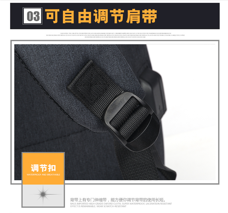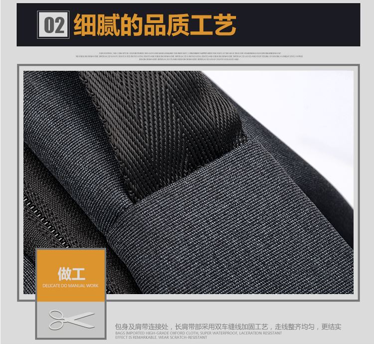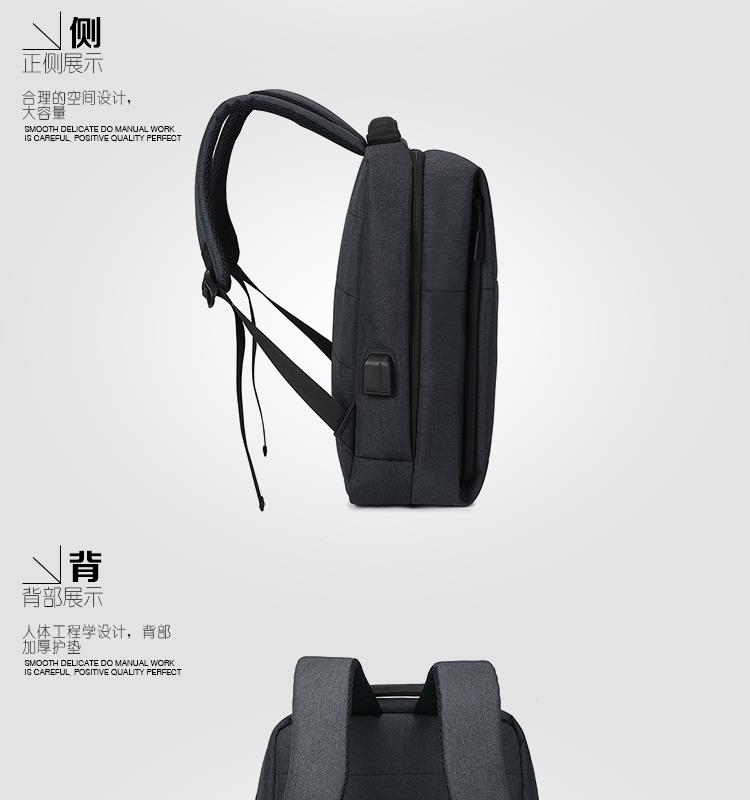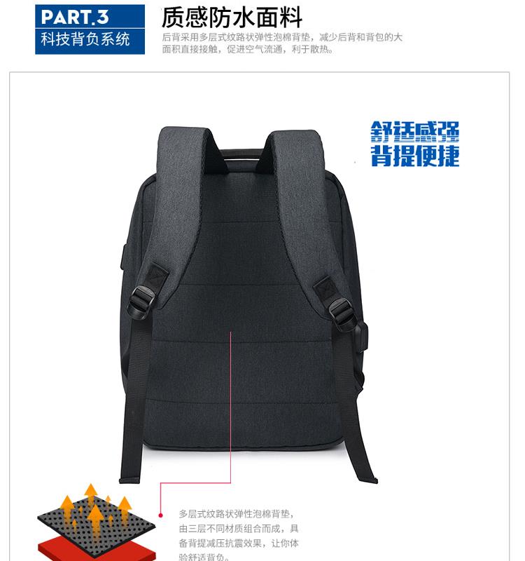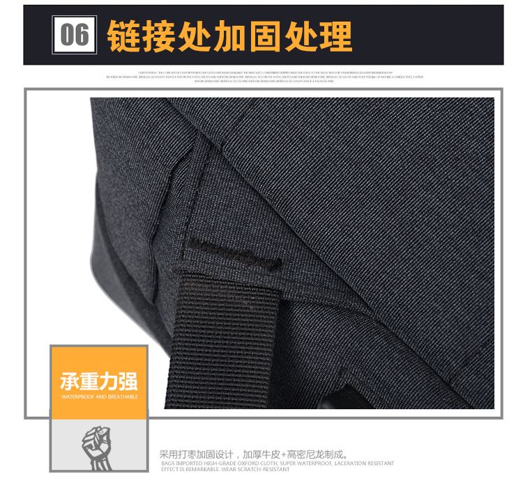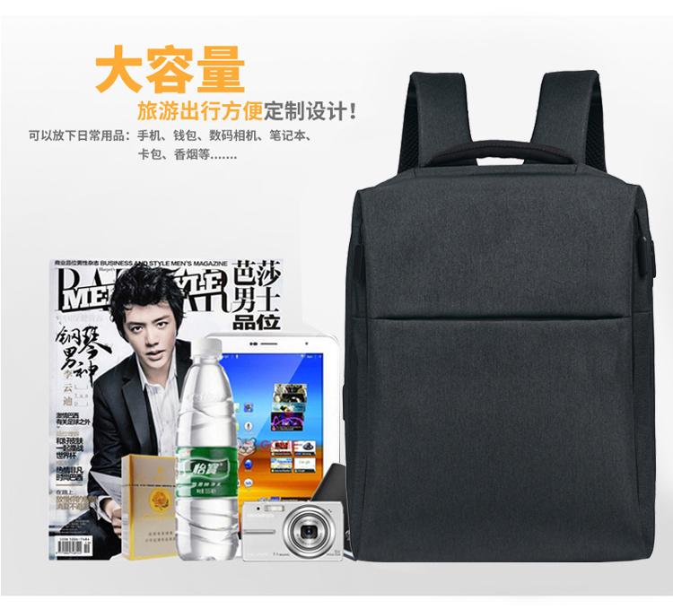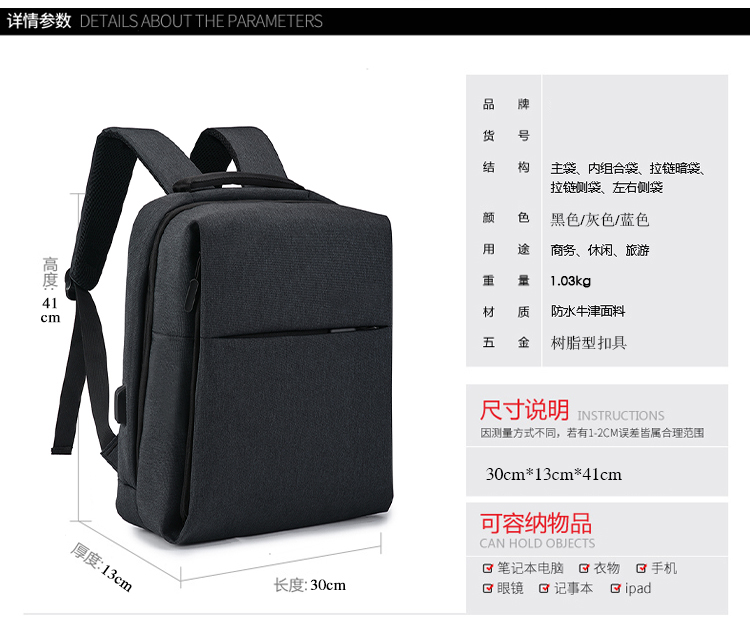 产品参数: 型号:背包3105 颜色:黑,灰,蓝 尺寸:30*13*41cm 材质:防水牛津布 重量:1kg 商品简介: 专业科技环保面料,舒适感强, 背提便捷。大容量,旅游出行方便定制设计!