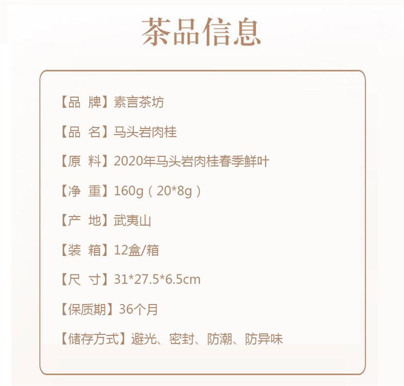 产品品名:马头岩肉桂 产品信息:2020年马头岩肉桂160克 规格:31*27.5*6.5cm 产地:福建武夷山