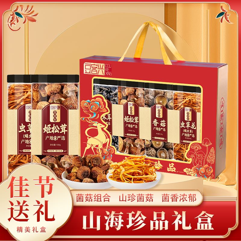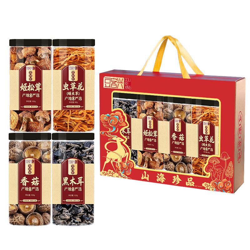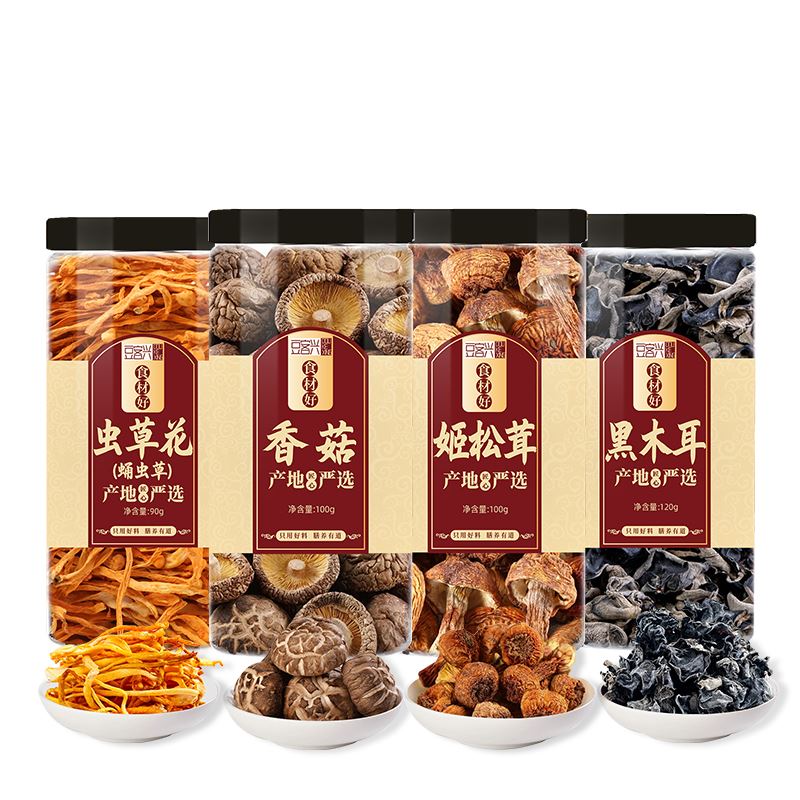蛹虫草90g,黑木耳120g,香菇100g,姬松茸100g