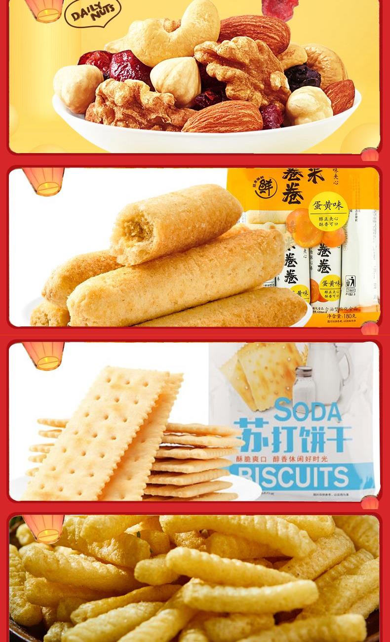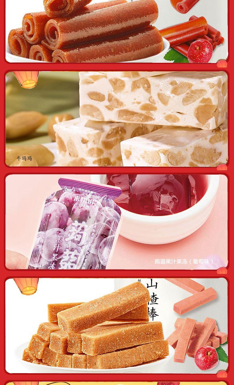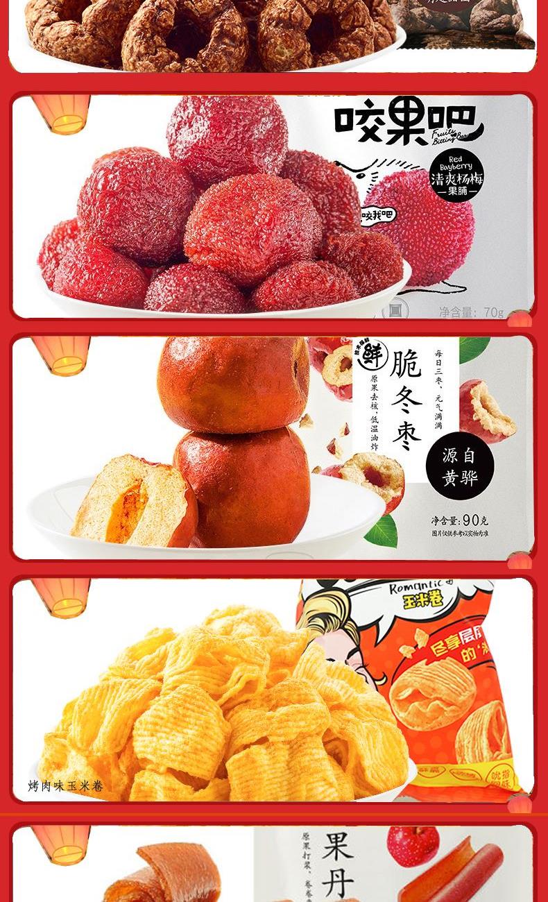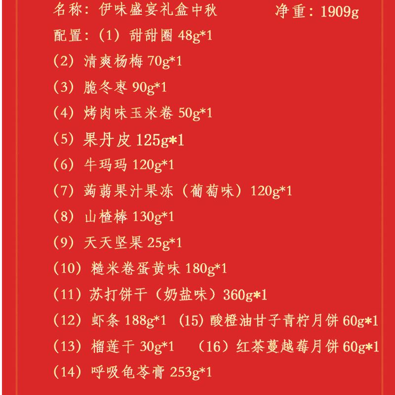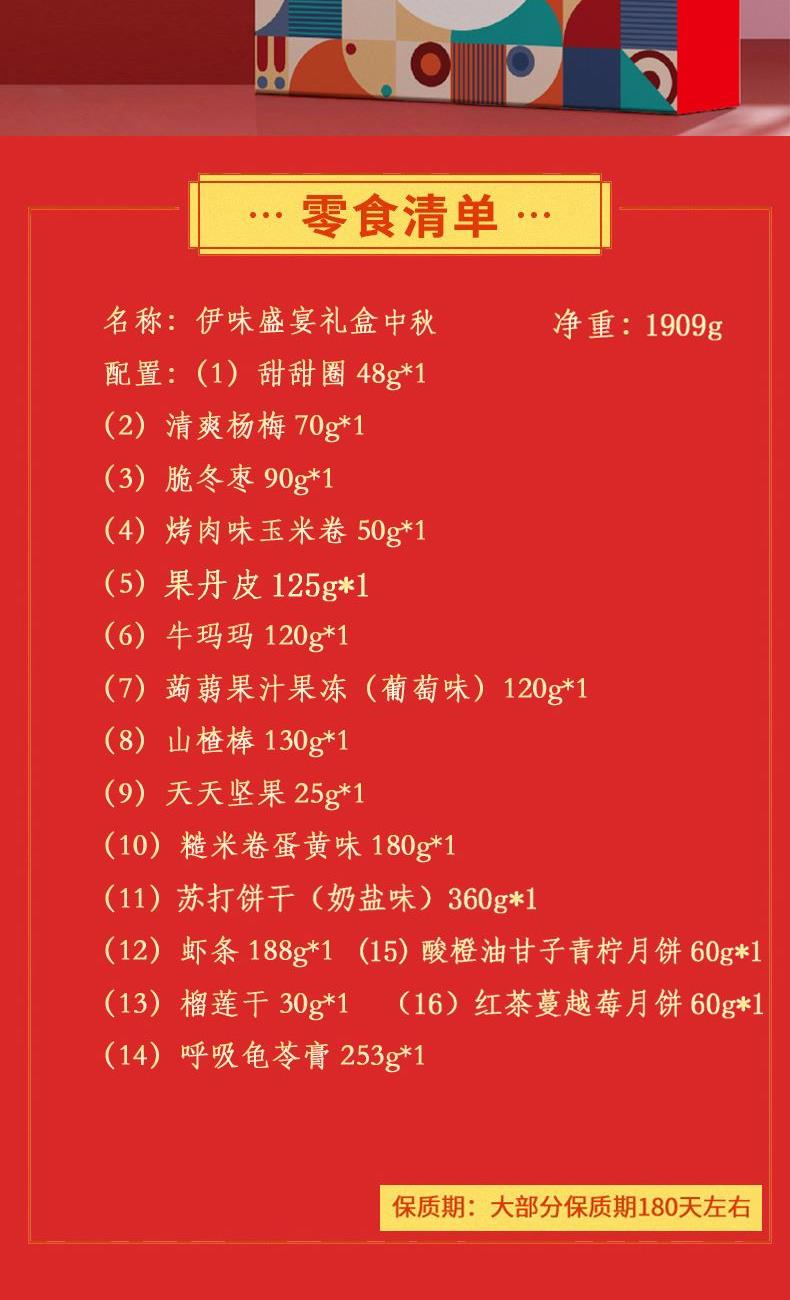 来伊份伊味盛宴礼盒1789g 甜甜圈48g*1 清爽杨梅70g*1 脆冬枣90g*1 烤肉味玉米卷50g*1 果丹皮125g*1 牛玛玛120g*1 蒟蒻果汁果冻(葡萄味)120g*1 山楂棒130g*1 益生菌每日坚果25g*1 糙米卷蛋黄味180g*1 苏打饼干(奶盐味)360g*1 虾条188g*1 榴莲干30g*1 呼吸龟苓膏253g*1