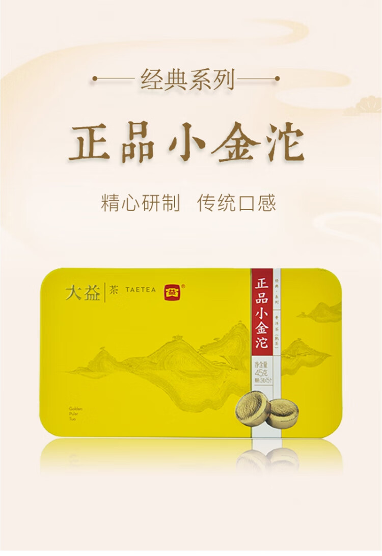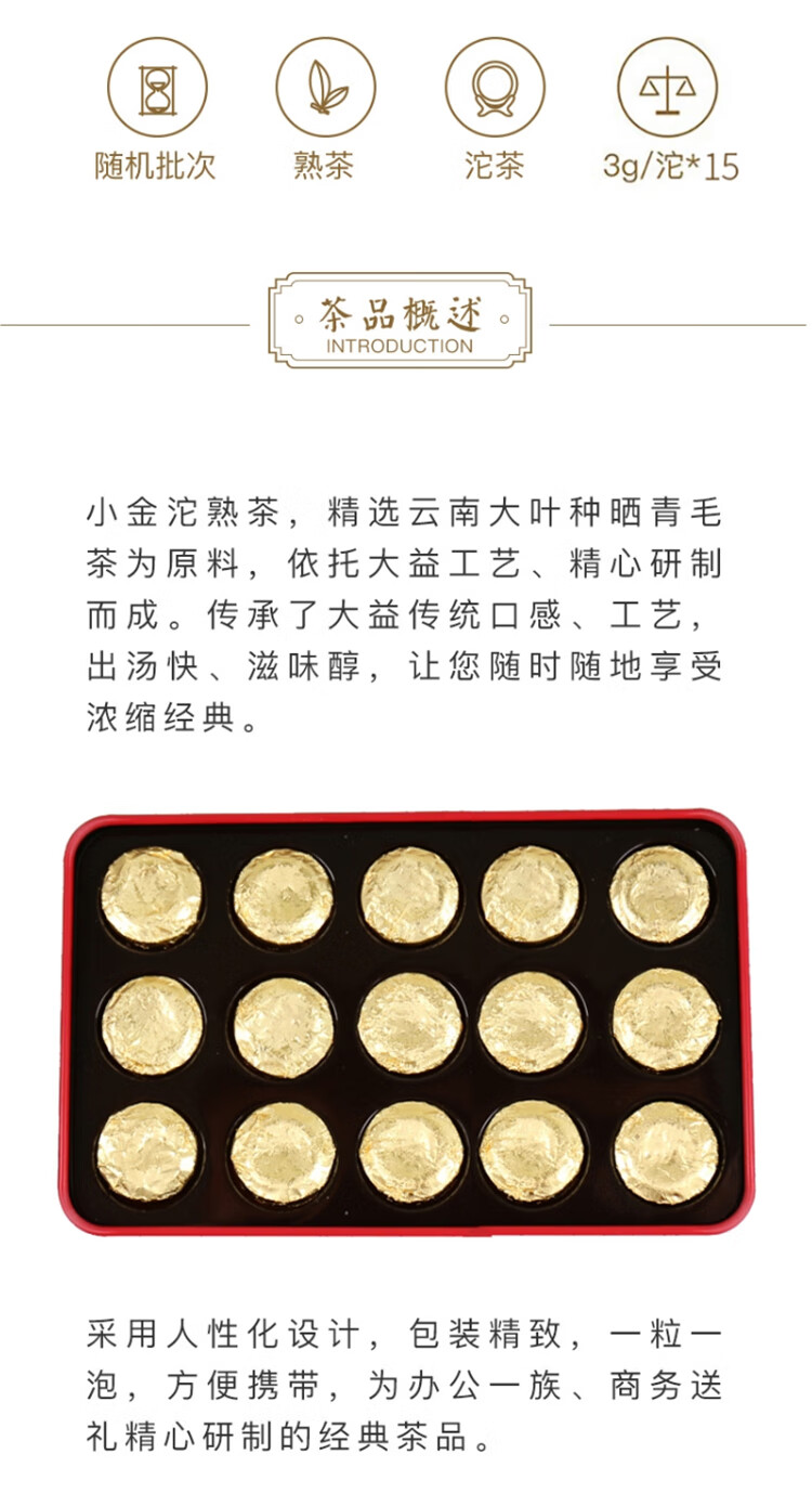 品牌: 大益 商品名称:大益茶叶 普洱茶 小金沱 随机年份 熟茶【1盒】45克 商品编号:10044104629143 店铺: 大益茶叶专卖店 建议茶具:飘逸杯,盖碗 茶区:勐海茶区 采摘地:云南 包装形式:盒装 发酵程度:后发酵 类型:紧压茶 储存方法:防潮;防异味;干燥;通风;常温保存 保质期:长期保存 总净含量:45g