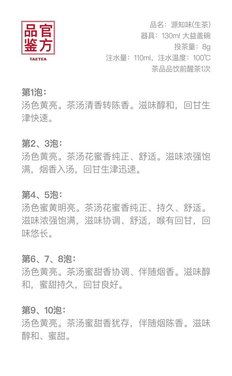 品牌: 大益 商品名称:大益茶叶普洱茶源知味茶叶礼盒生茶357g回甘蜜香持久 商品编号:10081649687778 店铺: 大益茶叶旗舰店 建议茶具:盖碗,紫砂壶 采摘海拔:1200-1800m 茶区:勐海茶区 类型:紧压茶 包装形式:礼盒装 发酵程度:后发酵 采摘地:云南 产品标准号:同包装 生产许可证号:SC11453282228141 储存方法:防潮;防异味;通风;常温保存 加工工艺:晒青;干燥 保质期:长期保存 总净含量:357g