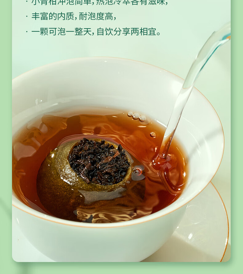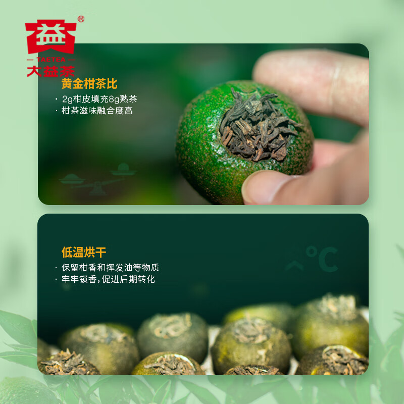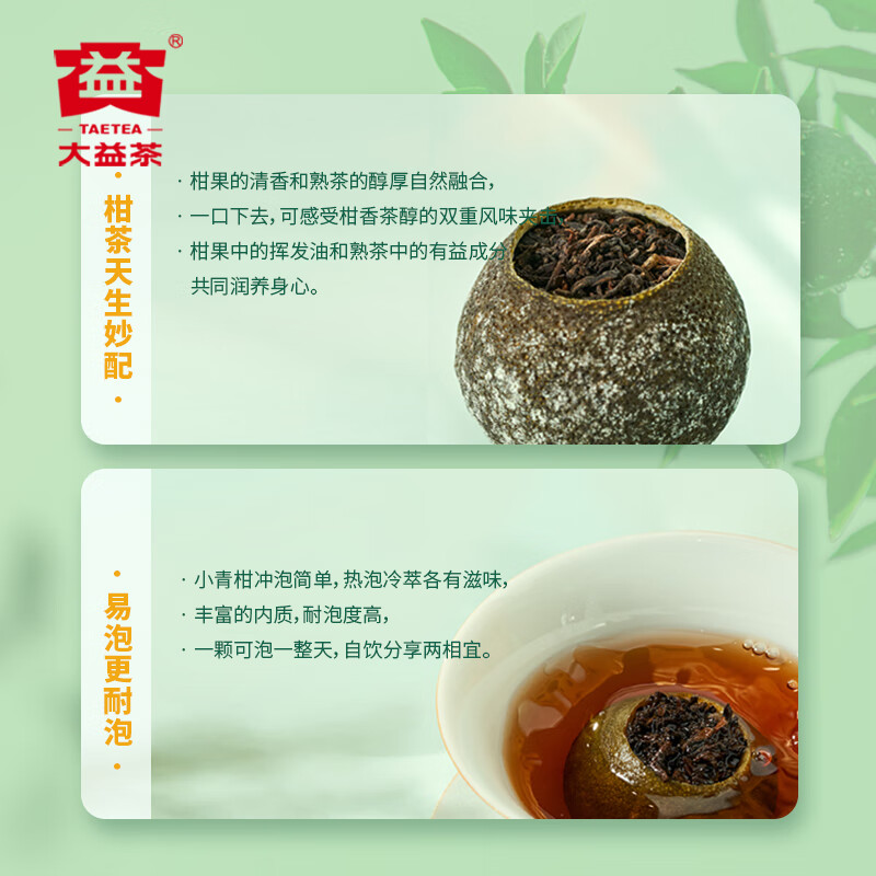 品牌: 大益 商品名称:大益网红青柑 商品编号:10100021609382 店铺: 大益茶叶旗舰店 茶叶等级:无 建议茶具:盖碗,紫砂壶 发酵程度:后发酵 采摘地:云南 包装形式:礼盒装 类型:小青柑 生产许可证号:SC11453282228141 产品标准号:同包装 储存方法:防潮;防异味;通风;避光;常温保存 保质期:长期保存 加工工艺:晒青;发酵;干燥 总净含量:216g