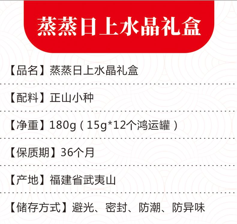 产品品名:水晶礼盒(正山小种) 产品信息:正山小种180g(15g*12个鸿运罐) 规格:31*29*7.8cm 产地:福建武夷山
