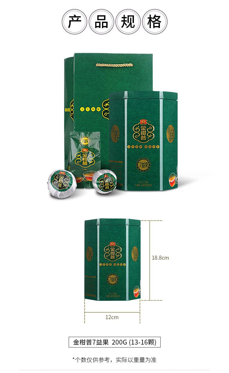 品牌: 大益 商品名称:大益金柑普-小青柑(7益果200g) 商品编号:29008512853 店铺: 大益普洱茶专卖店 类型:小青柑 建议茶具:飘逸杯,盖碗 包装形式:罐装 储存方法:避光;密封;防潮;干燥;通风 保质期:长期保存 总净含量:200g