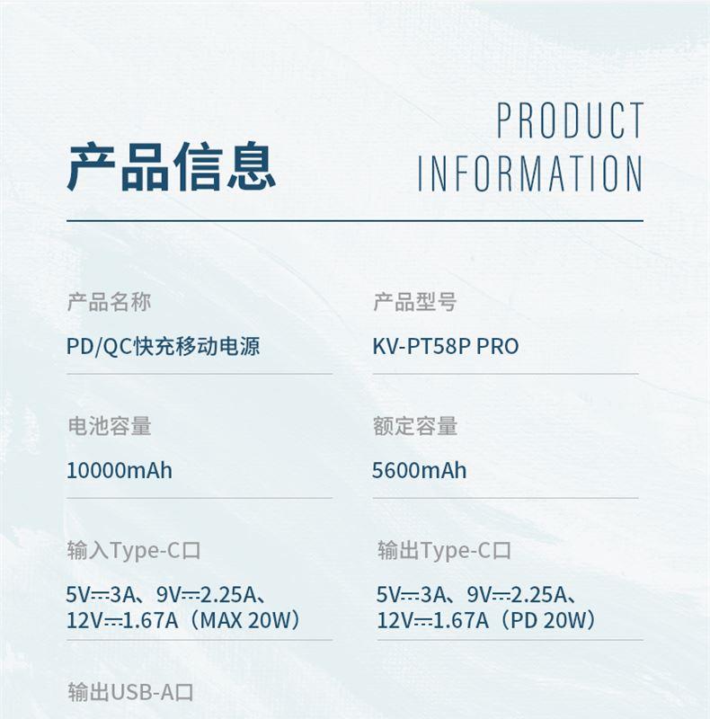 品牌:Kivee 产品名称:移动电源 产品型号:KV-PT58Ppro 69码:6941256115374/6941256115381/6941256115398/6941256115404/6941256115411