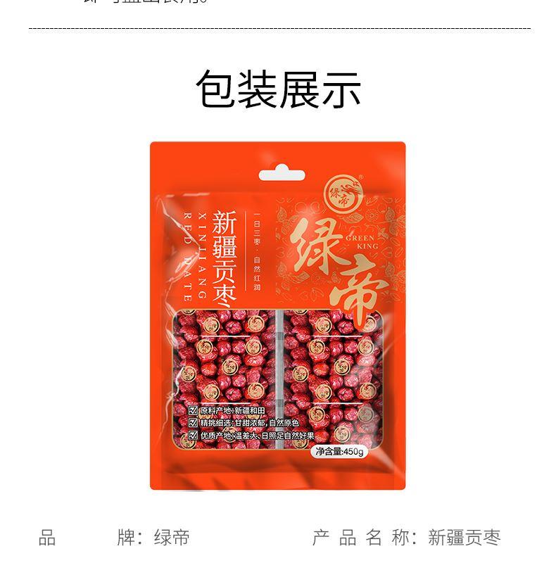 商品名称:绿帝新疆贡枣 重量:450g/袋 产地:新疆和田 保质期:300天