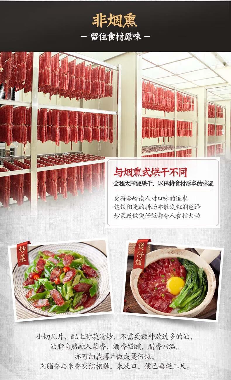 产地;广东 特产品类;广式腊肠 包装形式;袋装 食用方法;烹饪食用 加工工艺;烘干 保质期;120天