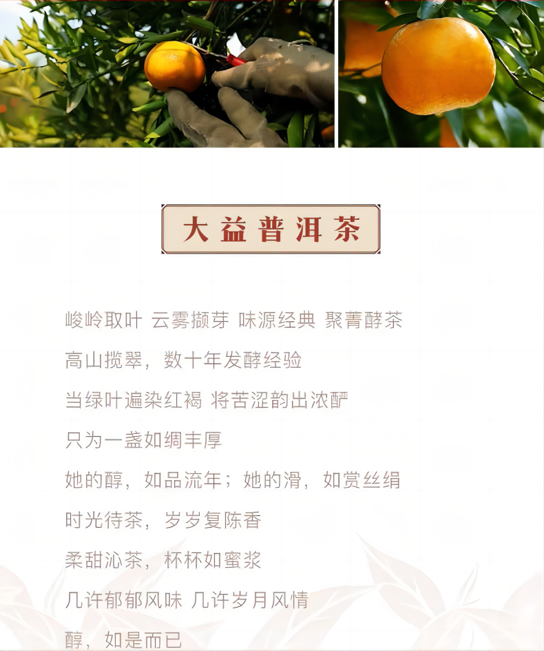 品牌: 大益茶 商品名称:大益茶200g 商品编号:100104908232 建议茶具:飘逸杯,盖碗 发酵程度:全发酵 类型:小青柑 包装形式:礼盒装 茶区:勐海茶区 采摘海拔:<1200m 保质期:长期保存 储存方法:避光;密封;通风;防潮;干燥 总净含量:200g