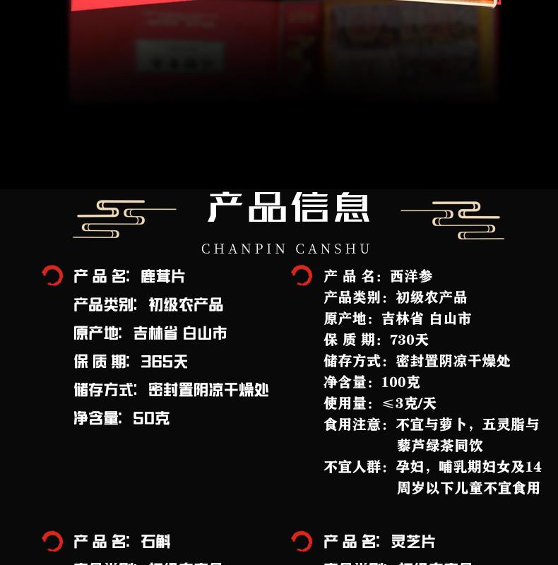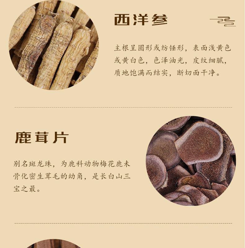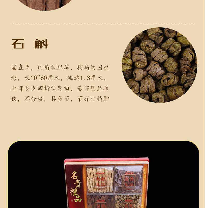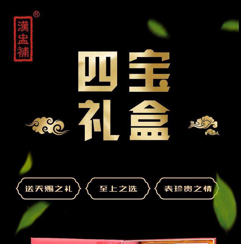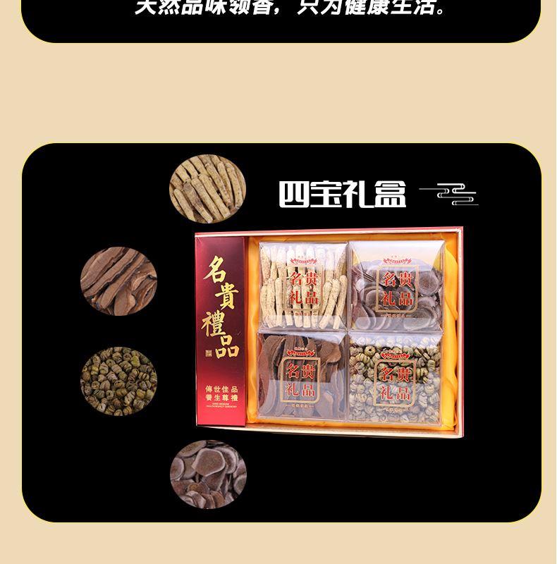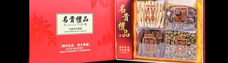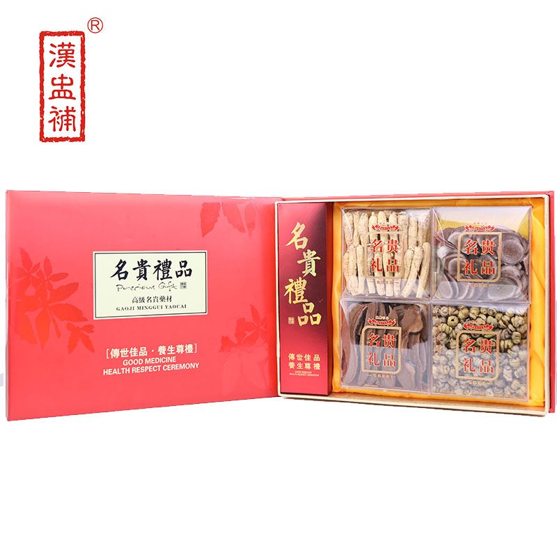 产品名称:汉盅补名贵礼品-四宝礼盒装300克 净重:300g(灵芝片50g、石斛100g、西洋参条100g、鹿茸片50g) 规格:礼盒装
