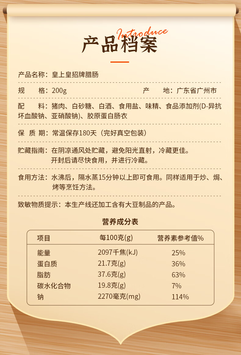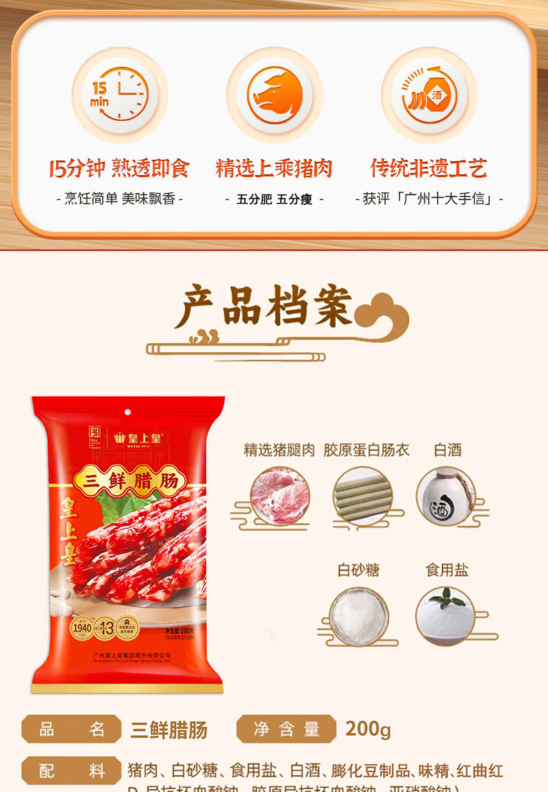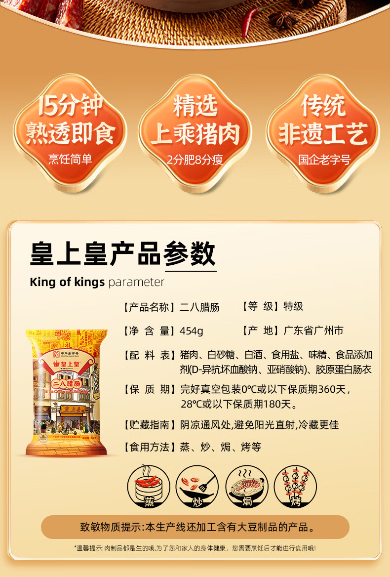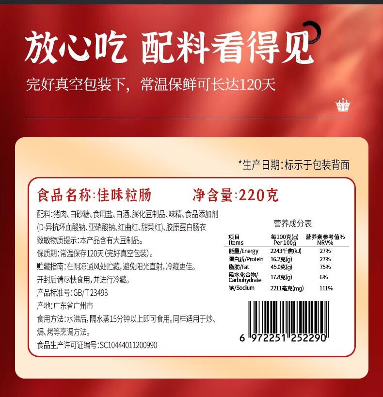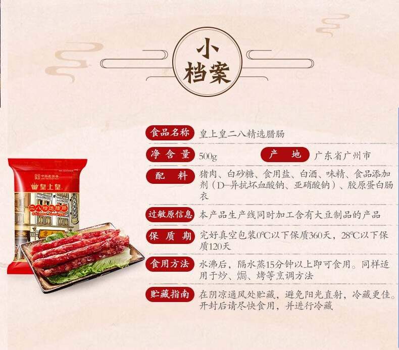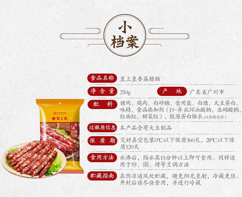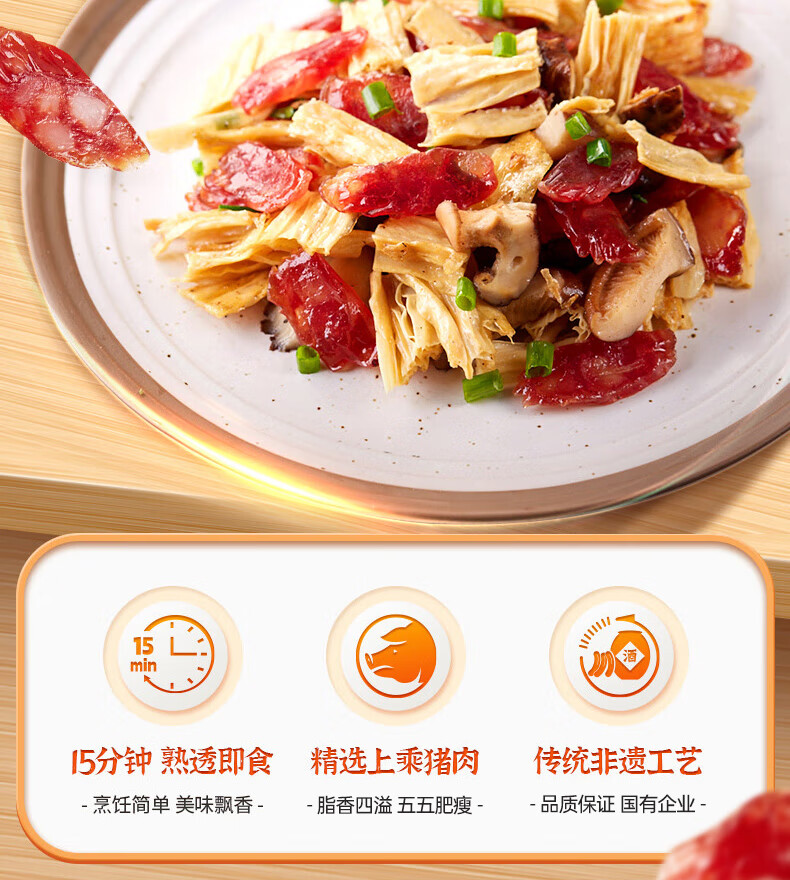 特产品类;广式腊肠 包装形式;袋装 食用方法;烹饪食用 加工工艺;不烟熏 保质期;120天