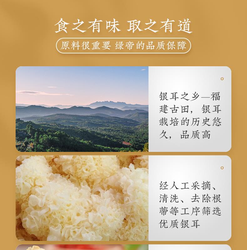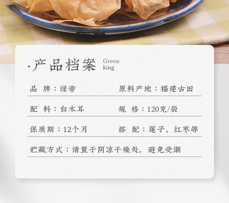 商品名称:绿帝白木耳 重量:120g/袋 产地:福建宁德 保质期:365天