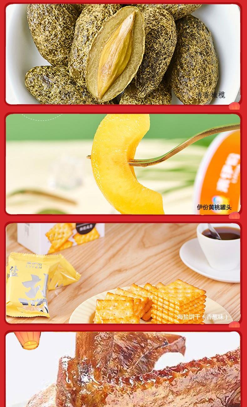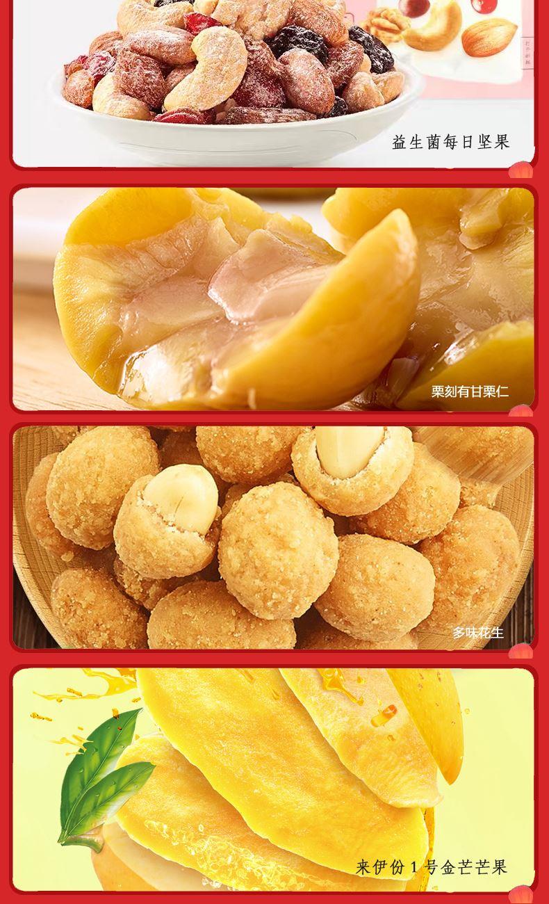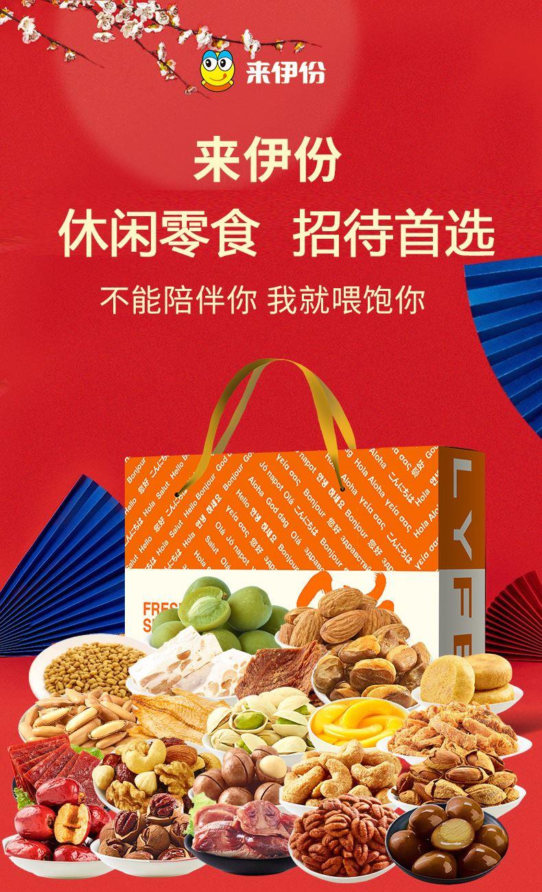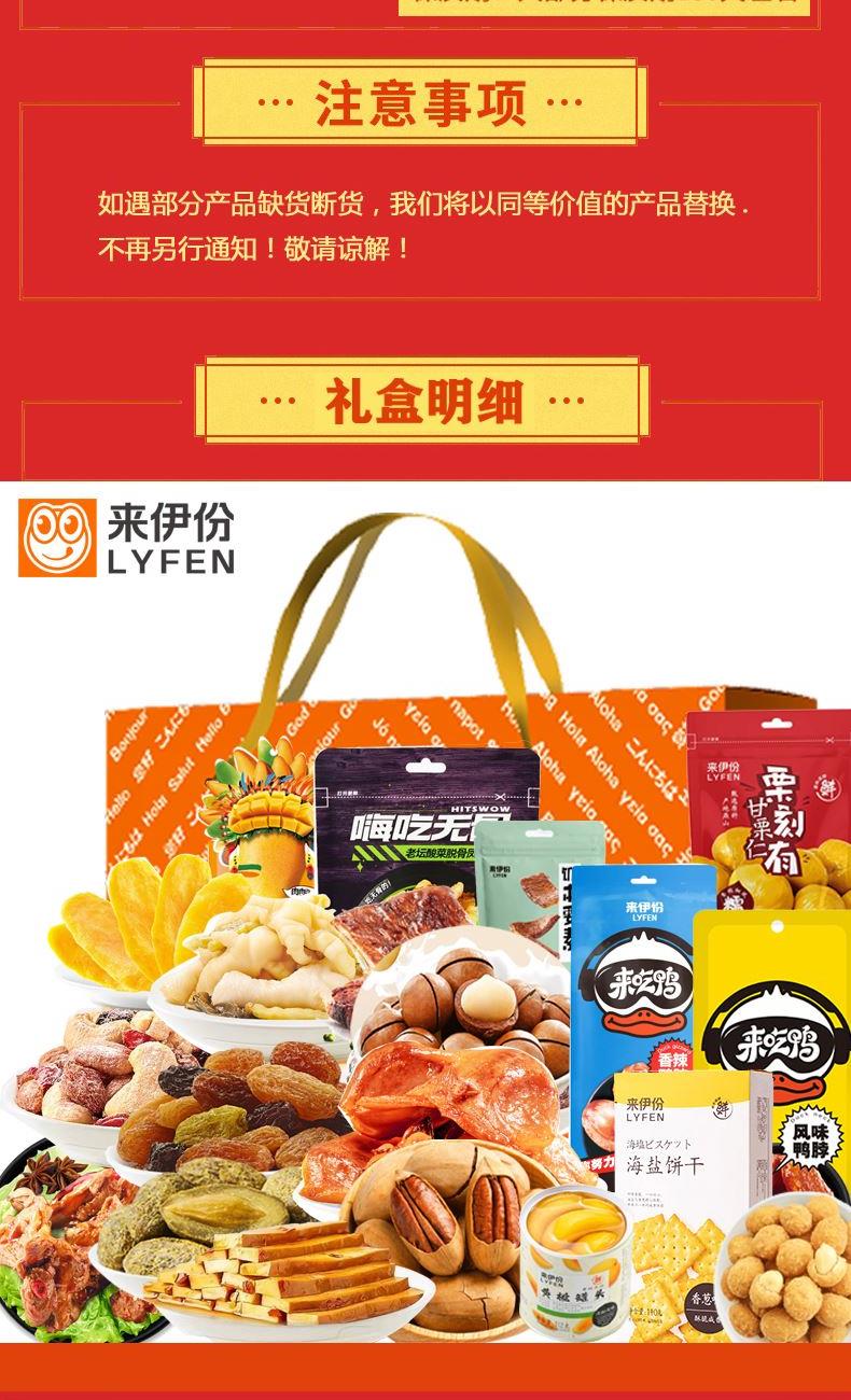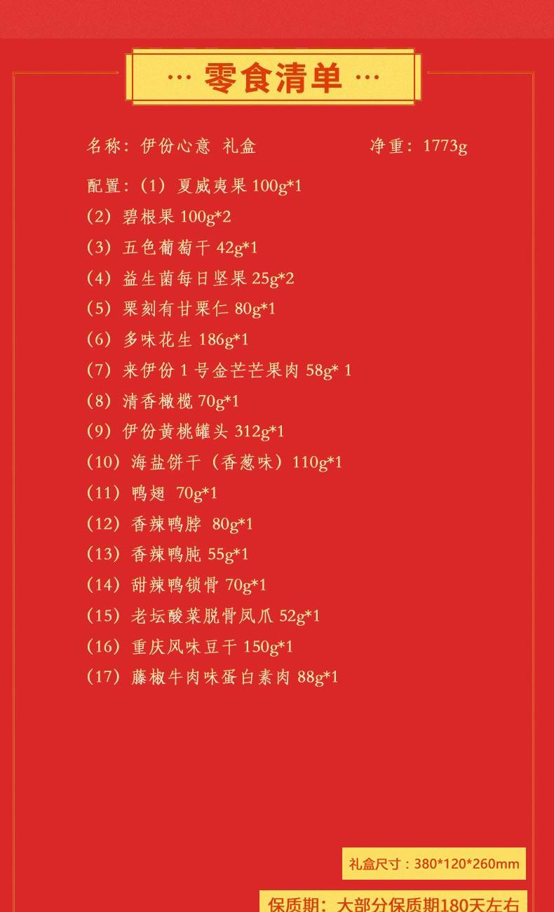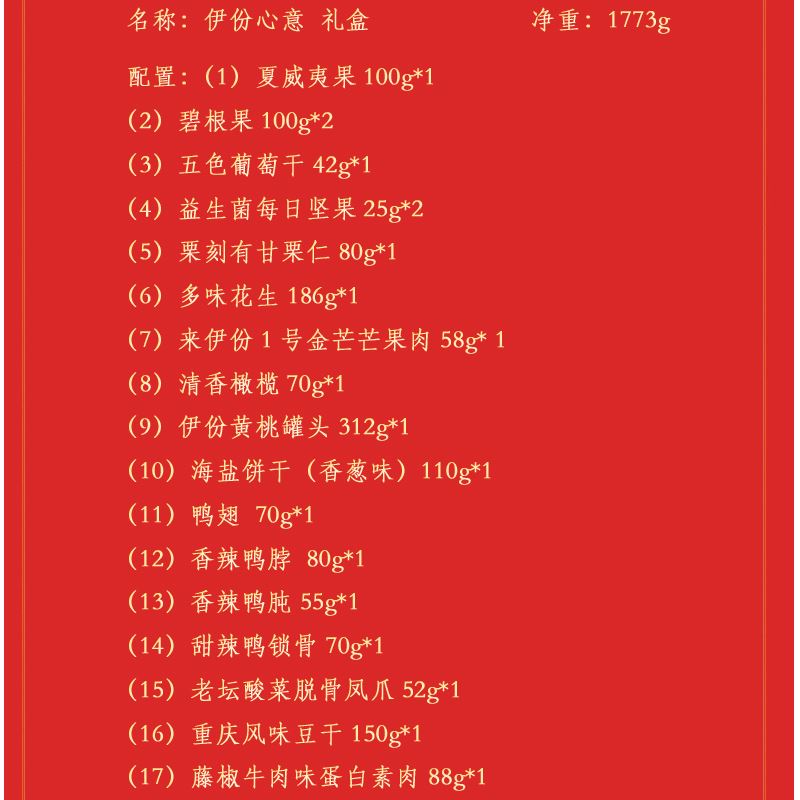 来伊份伊份心意礼盒1773g 夏威夷果100g*1 碧根果100g*2 五色葡萄干42g*1 益生菌每日坚果25g*2 栗刻有甘栗仁80g*1 多味花生186g*1 来伊份1号金芒芒果肉58g*1 清香橄榄70g*1 伊份黄桃罐头312g*1 海盐饼干(香葱味)110g*1 鸭翅70g*1 香辣鸭脖80g*1 香辣鸭肫55g*1 甜辣鸭锁骨70g*1 老坛酸菜脱骨凤爪52g*1 重庆风味豆干150g*1 藤椒牛肉味蛋白素肉88g*1
