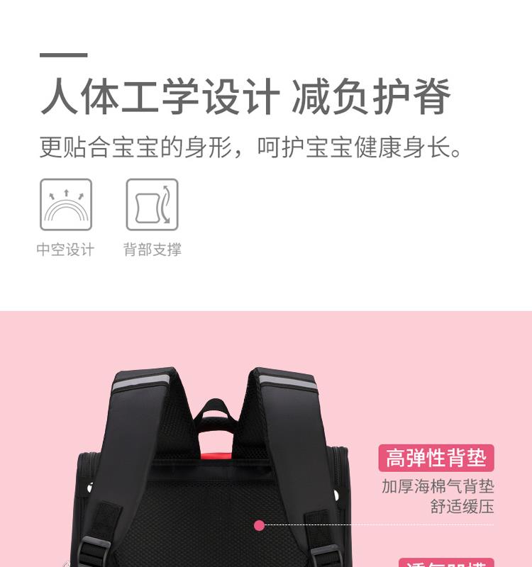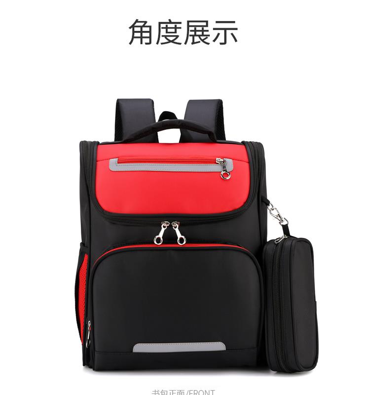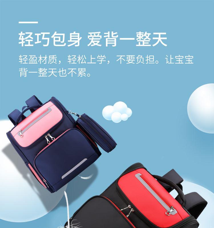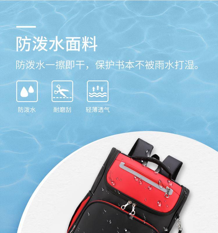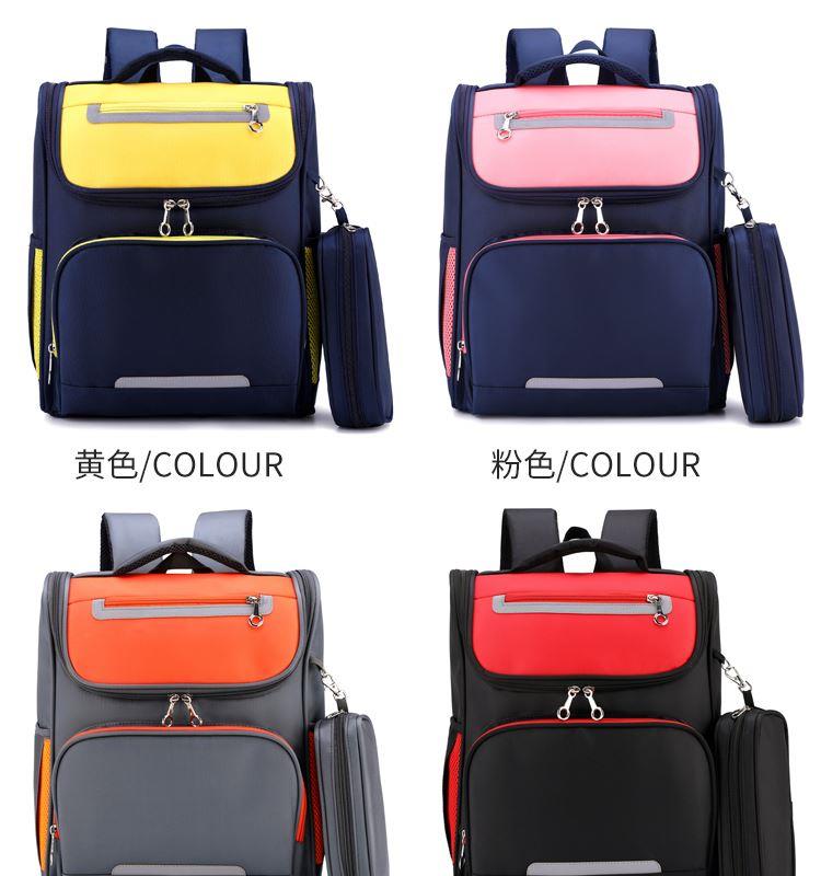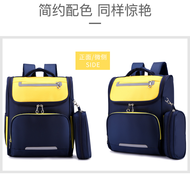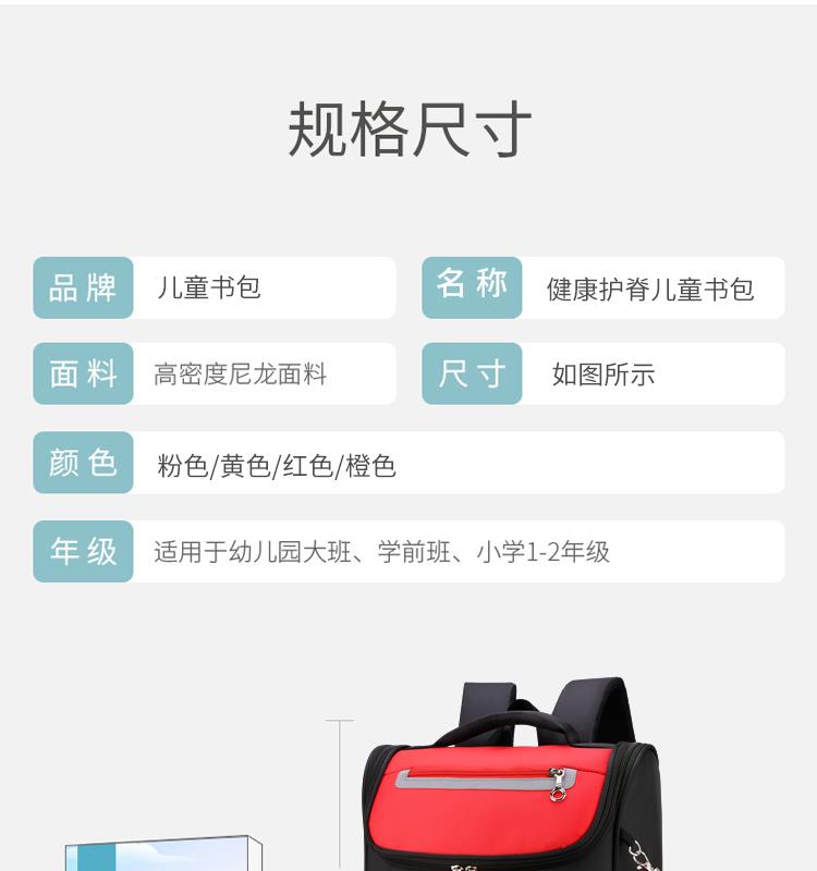 产品参数: 型号:儿童书包3202 颜色:黄蓝、粉蓝、黑红、橙灰 尺寸:30*16*38cm 材质:高密度尼龙面料 内部:有隔层 重量:0.45kg 商品简介: 防泼水面料,轻盈材质,人体工学设计,减负护脊。轻松上学,不要负担。书包肩带与侧面添加安全反光条的设计,让宝宝的出行更加安全。